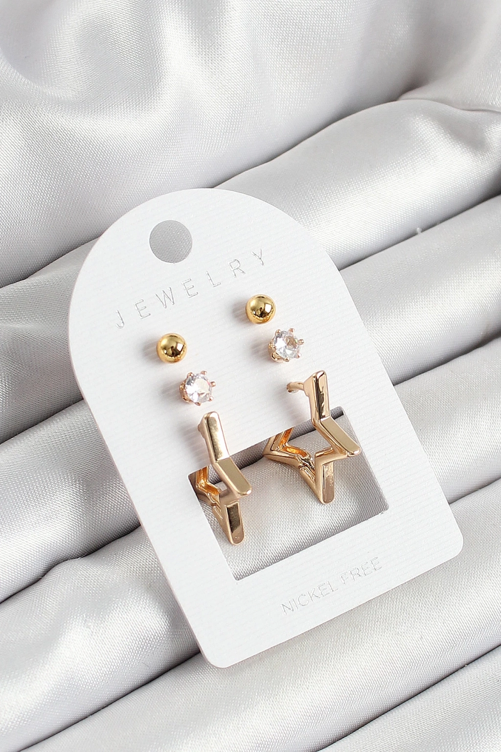 Pirinç Zirkon Taş Ve Yıldız Figürlü Gold Renk 3'lü Çift Kadın Küpe Set