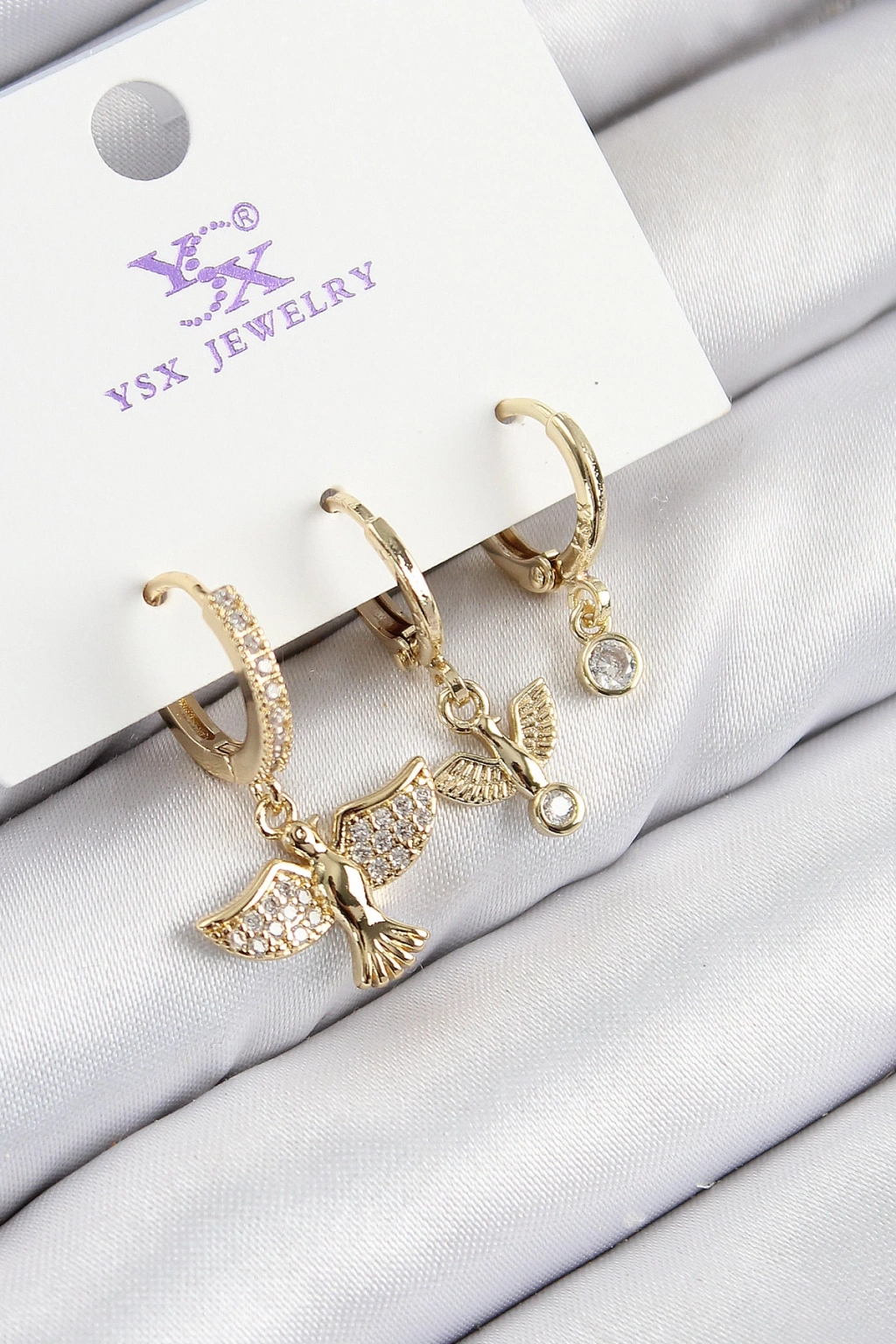 Pirinç Zirkon Taşlı 3'lü Kuş Model Gold Renk Kadın Küpe