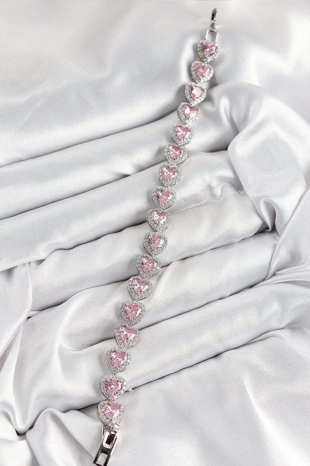 Pirinç Zirkon Taşlı Pembe Kalp Baget Model Gümüş Renk VIP Seri Kadın Bileklik
