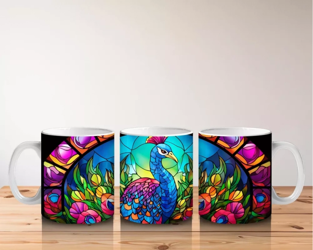 Renkli cam vitray stilindeki tavus kuşu, zarif ve sanatsal bir görünüm sergiliyor. Sanat ve doğa tutkunları için özel bir kupa tasarımı.