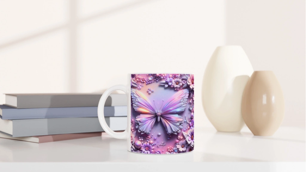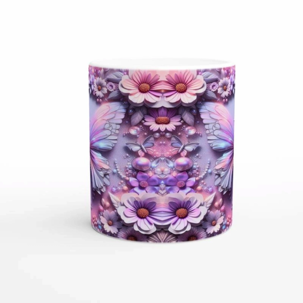 Renkli Kelebekler ve Çiçekler Temalı Baskılı Kupa Bardak, simetrik dizilimi ve büyüleyici mor-pembe tonlarıyla romantik ve zarif bir hava yaratır. Gündelik kullanımda estetik arayanlar ve hediye alternatifi düşünenler için harika bir seçenektir.