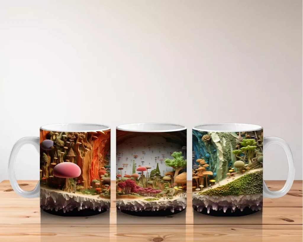 Renkli Mantarlarla Süslenmiş Fantastik Orman Manzarası – Baskılı Kahve Kupası