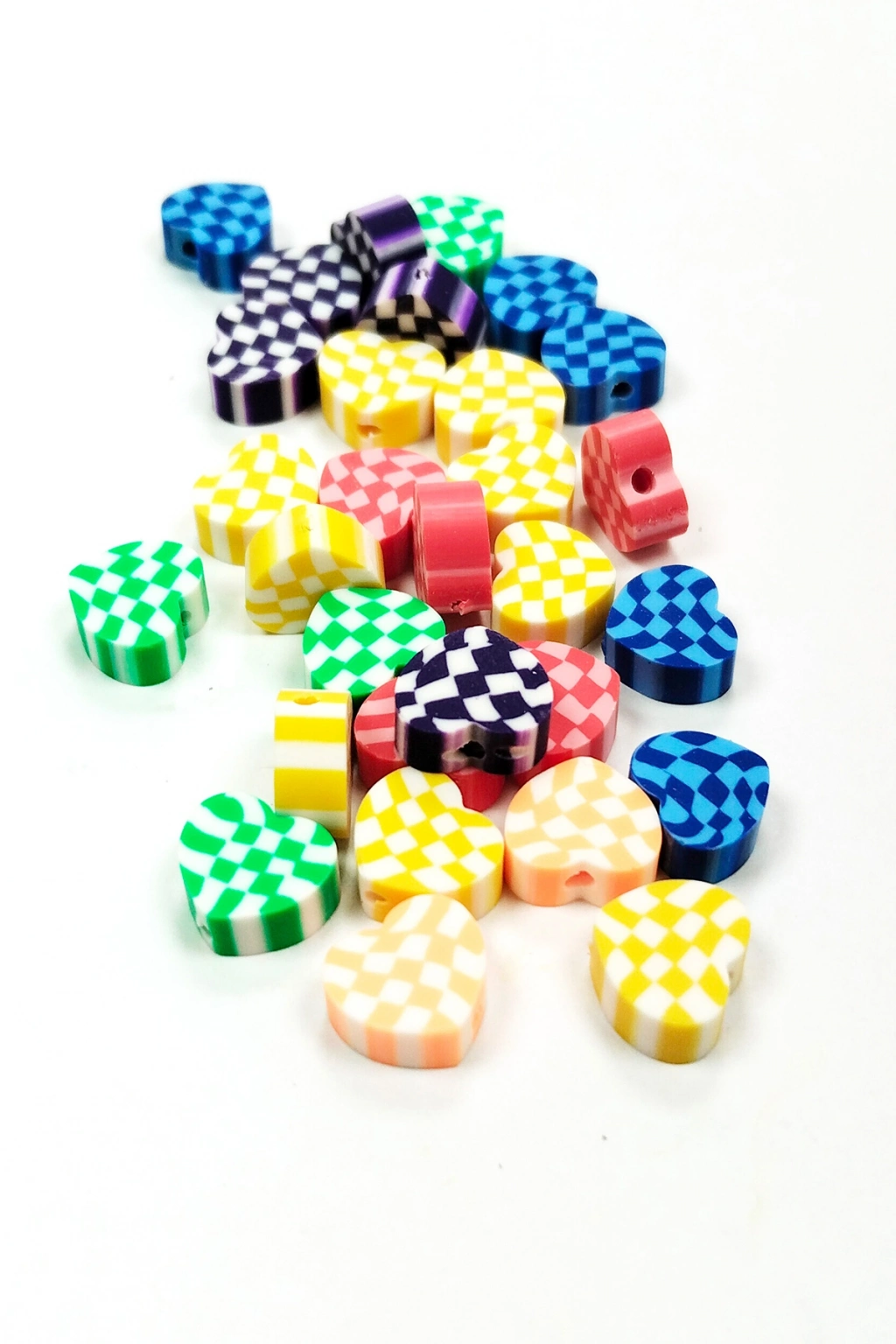 30 Adet 10 mm Polimer Kil Fimo Boncuk Takı Bileklik + 1 Metre Lastikli Misina Hediye - Desenli Kalp