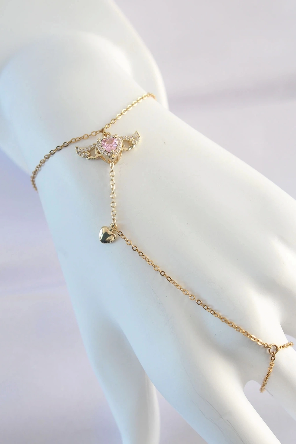 316L Çelik Gold Renk Pembe Zirkon Taşlı Kanatlı Kalp Model Şahmeran