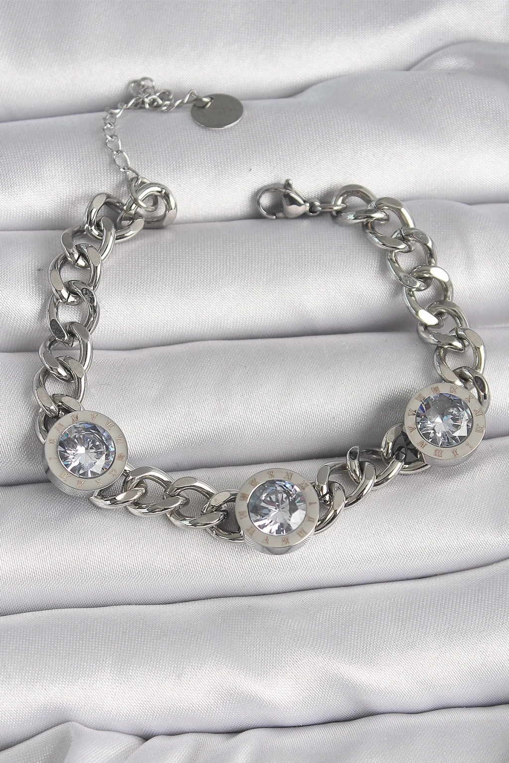 316L Çelik Gümüş Renk Zincir Model Zirkon Taşlı İşleme Detaylı Kadın Bileklik