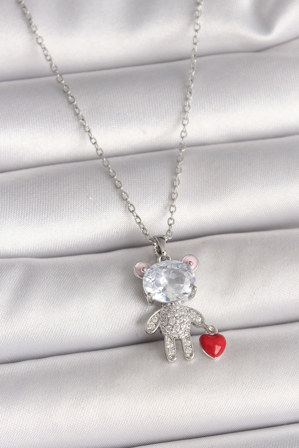 316L Çelik Gümüş Renk Zincir Zirkon Taşlı Ayıcık Model Kırmızı Kalp Detay Kadın Kolye