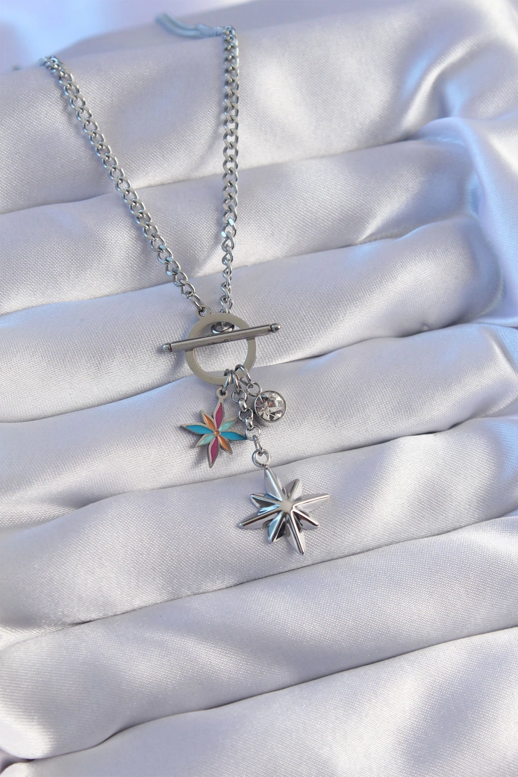 316L Çelik Zincir Gold Renk Renkli Mineli Zirkon Taşlı Kutup Yıldızlı Kolye