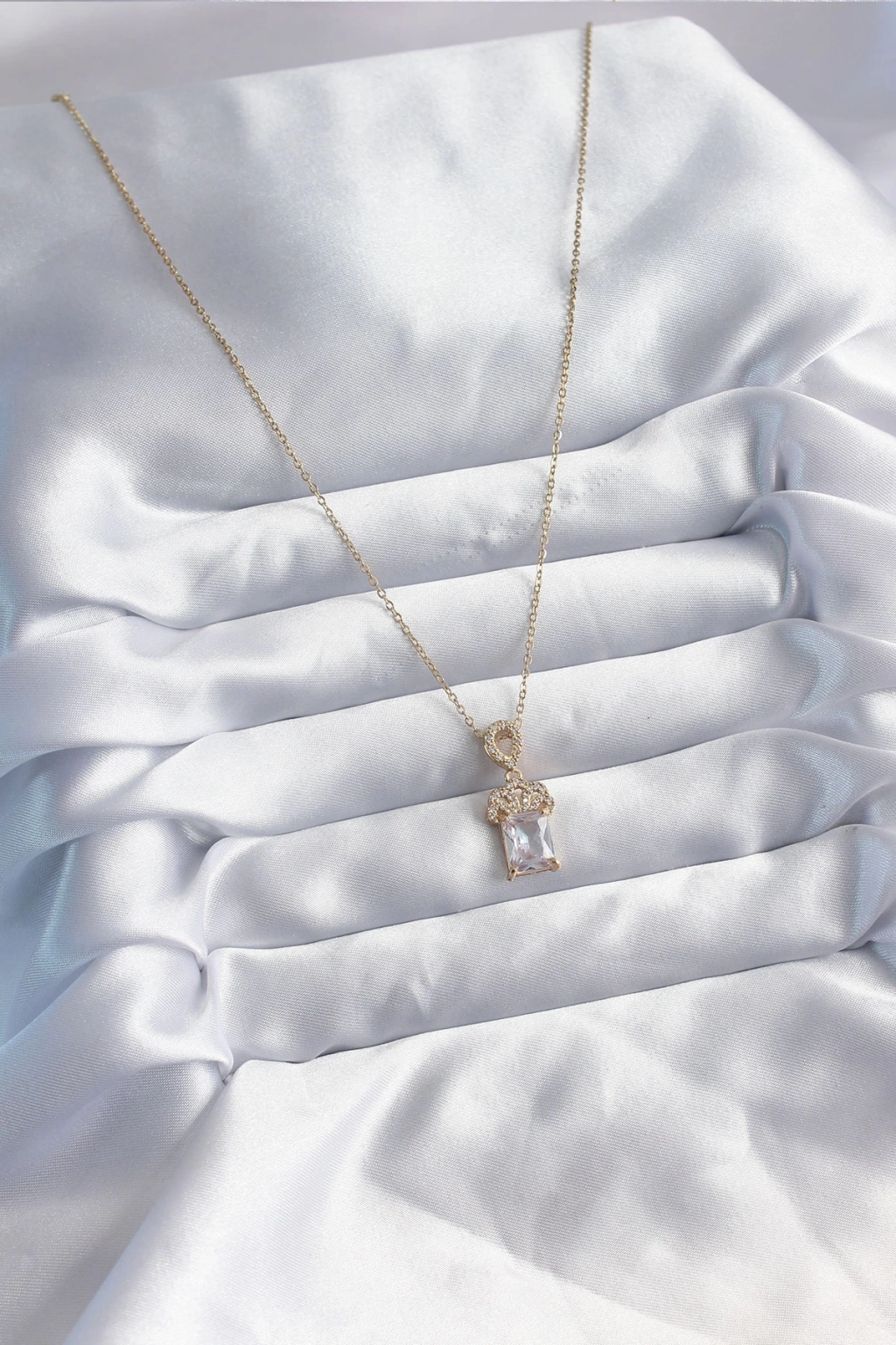 316L Çelik Zincir Gold Renk Zirkon Taşlı Taç Model Kadın Kolye