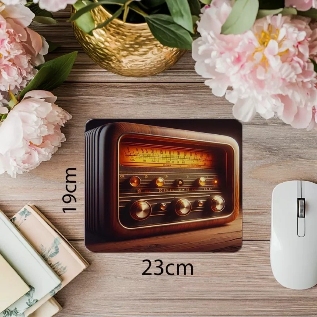 Ahşap gövdeli eski radyo estetiğine sahip mousepad; ergonomik yüzeyi ve kaymaz tabanıyla çalışma alanınıza zamansız şıklık katar.