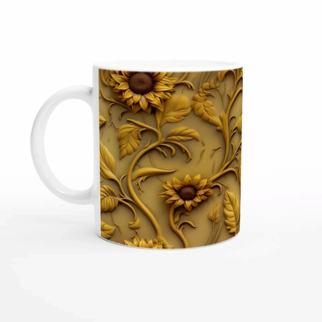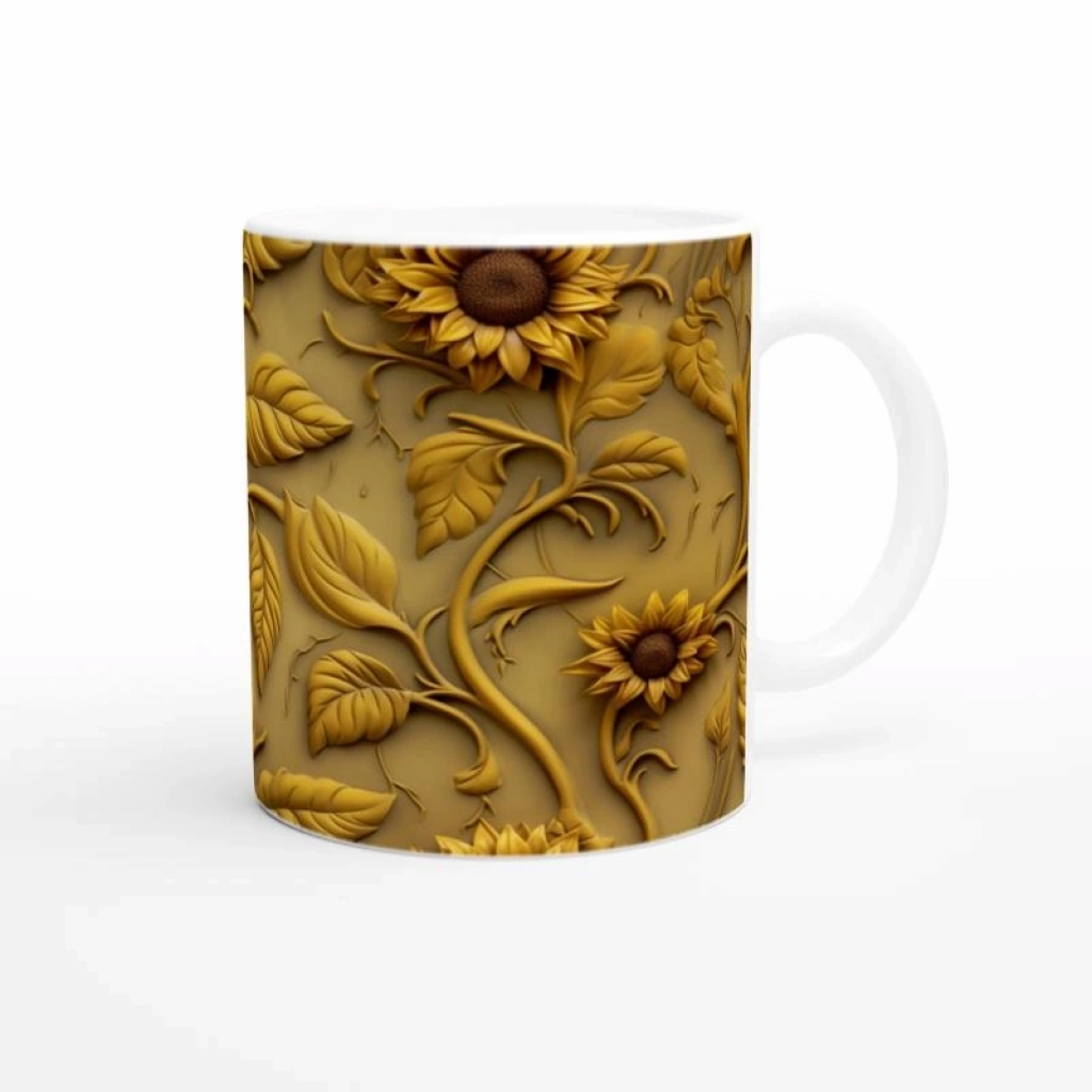 Zengin altın tonlarında, rölyef görünümlü ayçiçeği desenleriyle bezenmiş bu özel kupa bardak, klasik ve lüks tasarımlardan hoşlananlar için eşsiz bir tercih sunuyor.