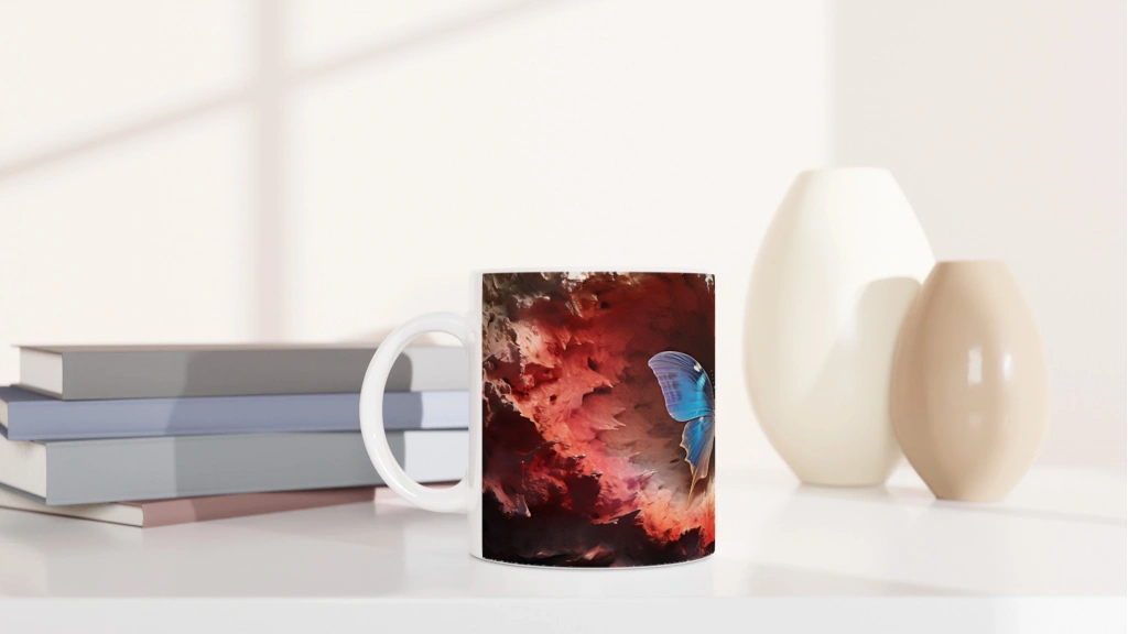 Ateş Çemberinden Doğan Mavi Kelebek Temalı Baskılı Kupa Bardak, alev kırmızısı ve gece tonlarının ortasında parlayan zarif bir kelebek figürüyle adeta yeniden doğuşu simgeliyor. Sanatı ve doğayı bir araya getiren bu özel tasarım, tutkulu ruhlara hitap ediyor.