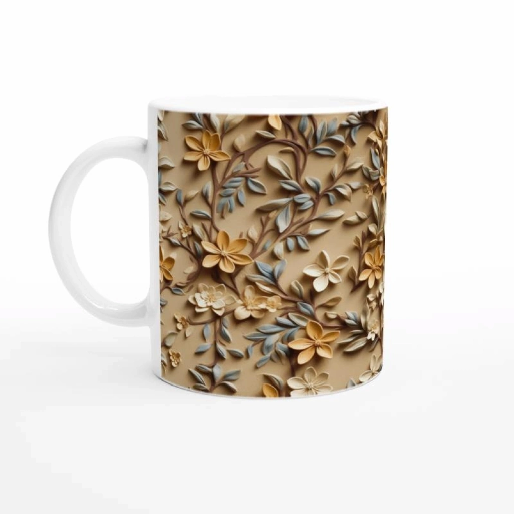 Bej Rölyef Dokulu Zarif Çiçek Desenli Kupa Bardak, yumuşak renk geçişleri ve üç boyutlu çiçek detaylarıyla içecek sunumuna huzurlu bir estetik katar. Doğal tasarımıyla hem rustik hem de klasik dekorasyonlara uyum sağlar, şıklığı sadelikle buluşturur.