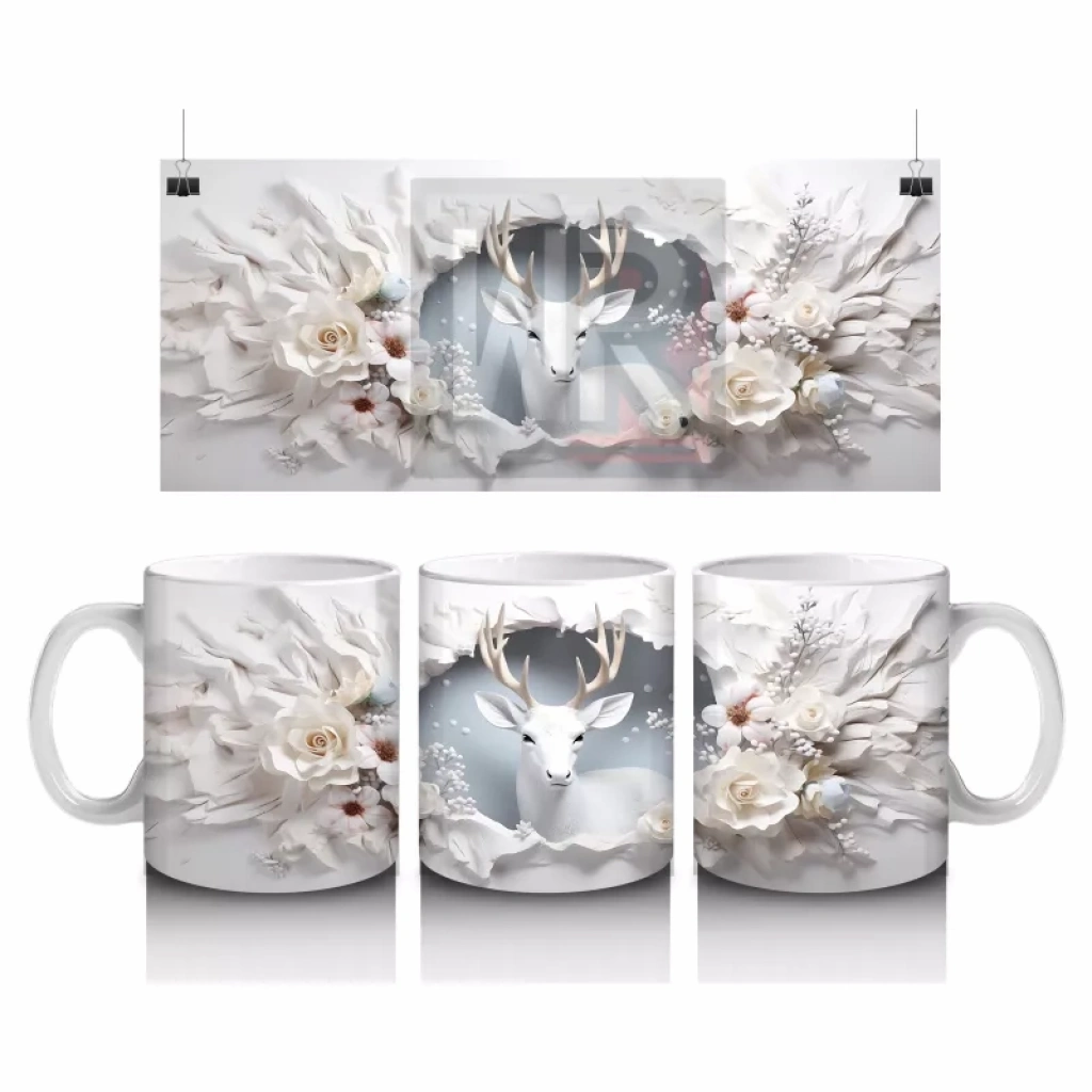 Zarif boynuzları ve duruşuyla dikkat çeken asil geyik, beyaz çiçekler arasında huzur veren bir görüntü sunuyor. Doğa temalı, estetik yönü güçlü bir kupa arayanlar için etkileyici bir tercih.