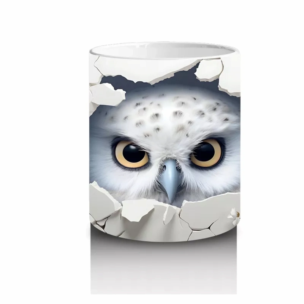 Beyaz çiçeklerin arasında sakin ve dikkatli bakışlarıyla öne çıkan bilge baykuş, doğa ve bilgelik temalarını bir araya getiriyor. Huzurlu bir kahve deneyimi için ideal.