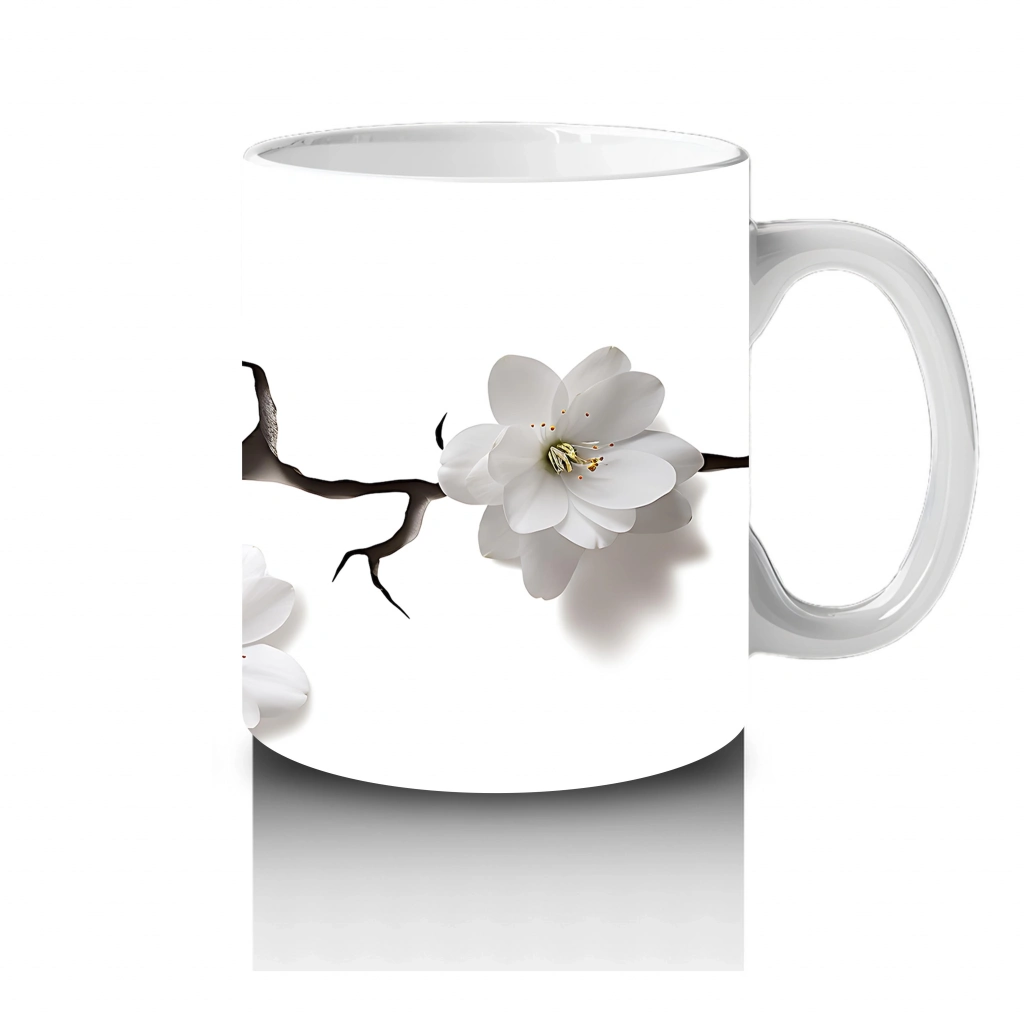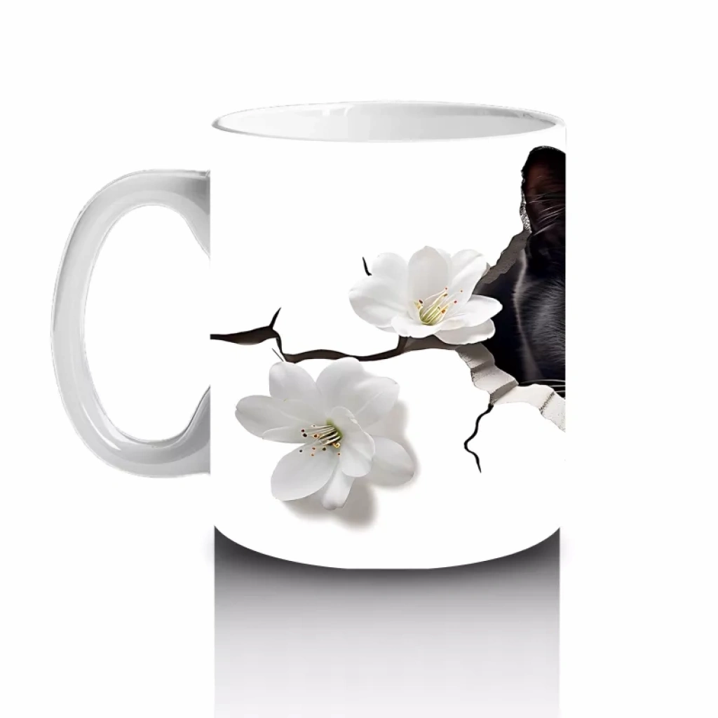 Beyaz Çiçeklerle Kaplı Siyah Kedi – Baskılı Kahve Kupası