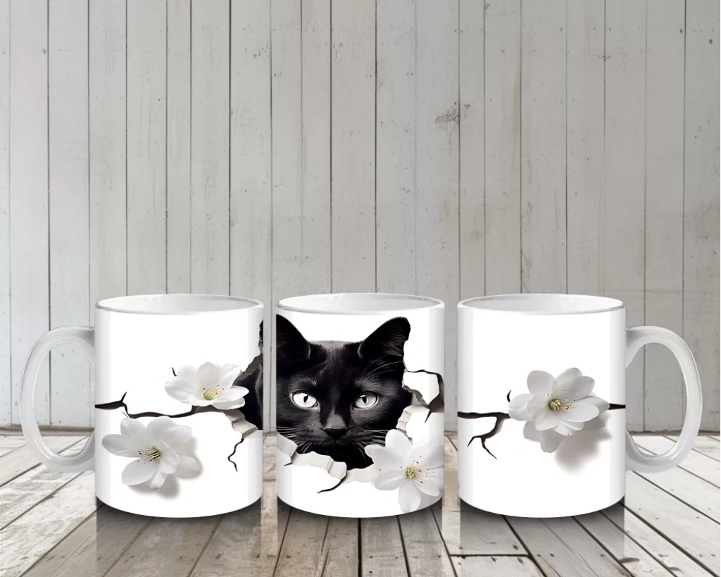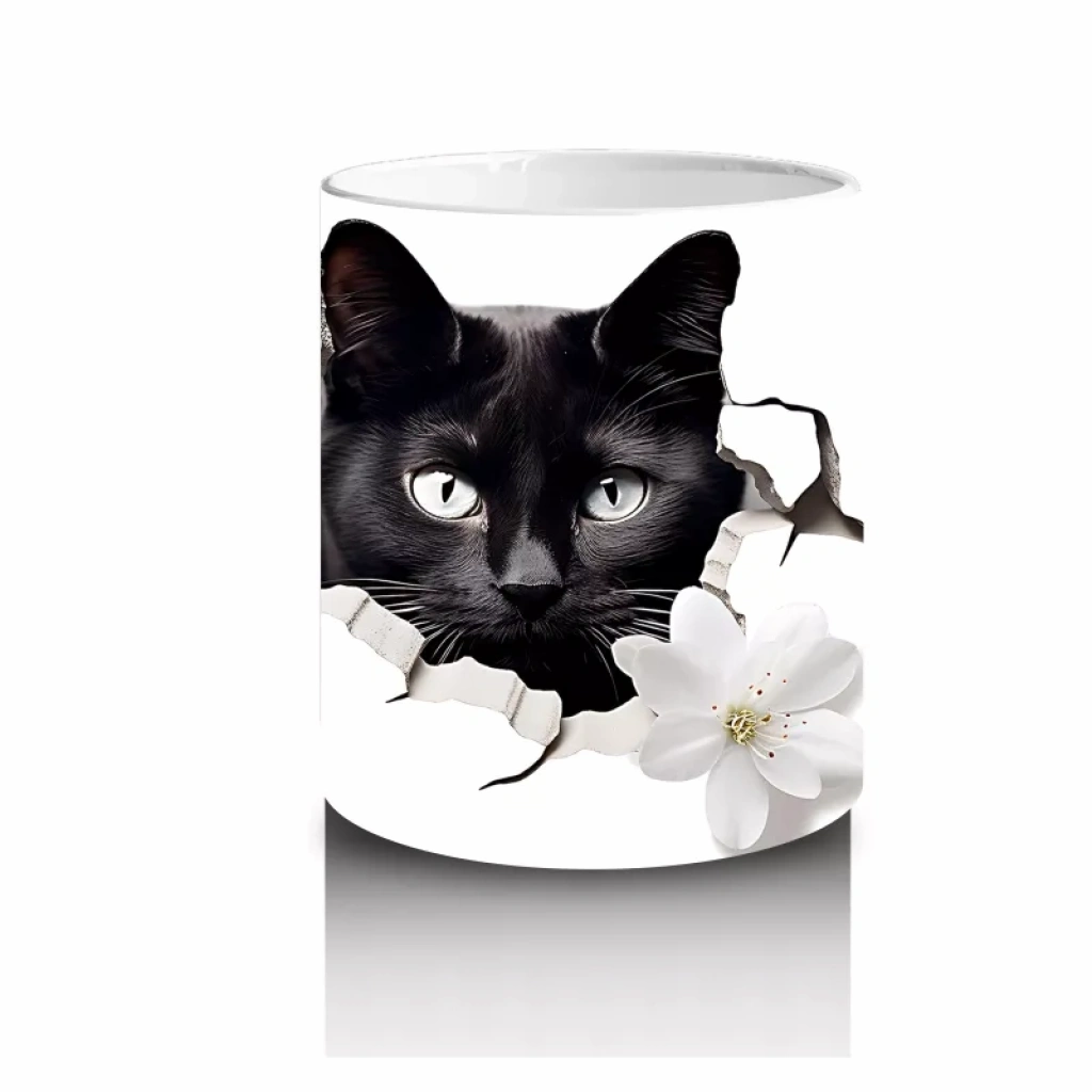 Beyaz çiçeklerin saflığı ile siyah kedinin zarif duruşu buluşuyor. Kontrastın estetiğini yansıtan bu özel tasarım, sadelikten hoşlananlara özel bir stil sunar. ??