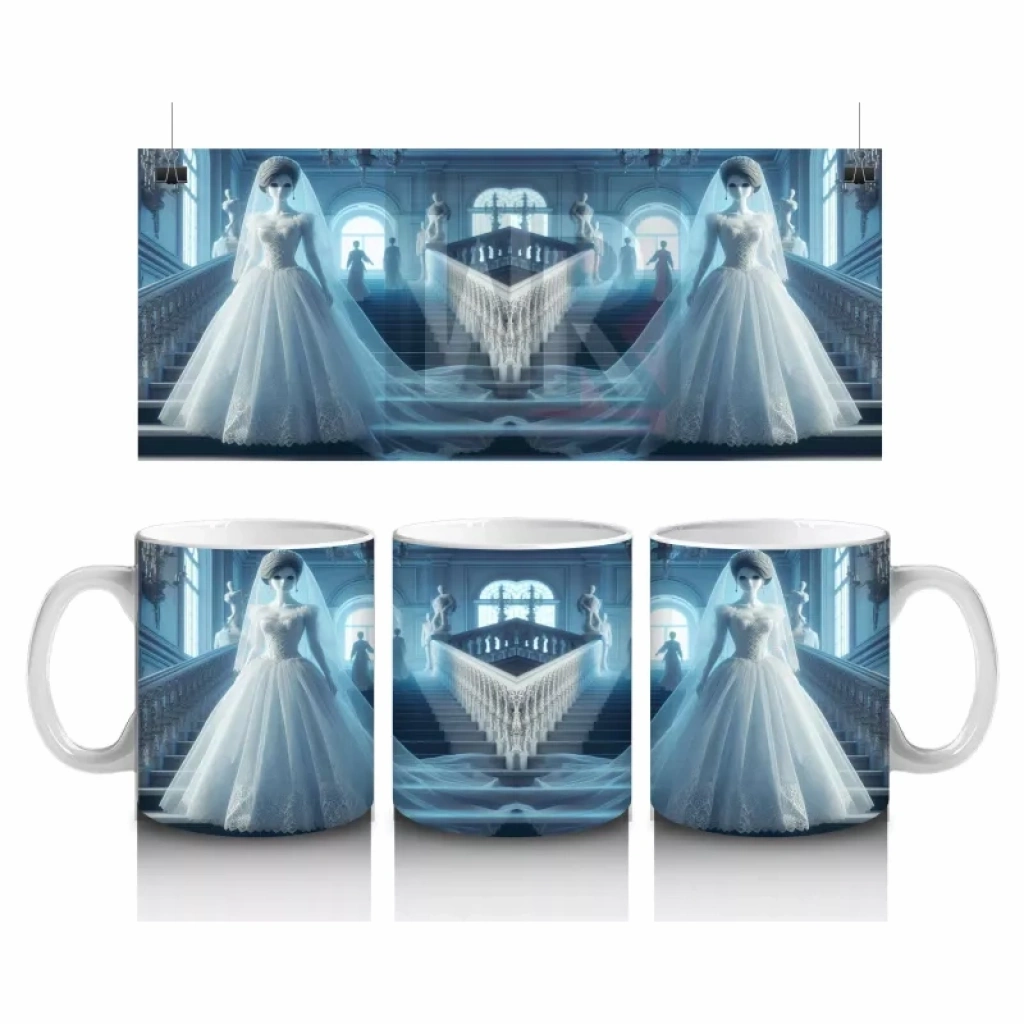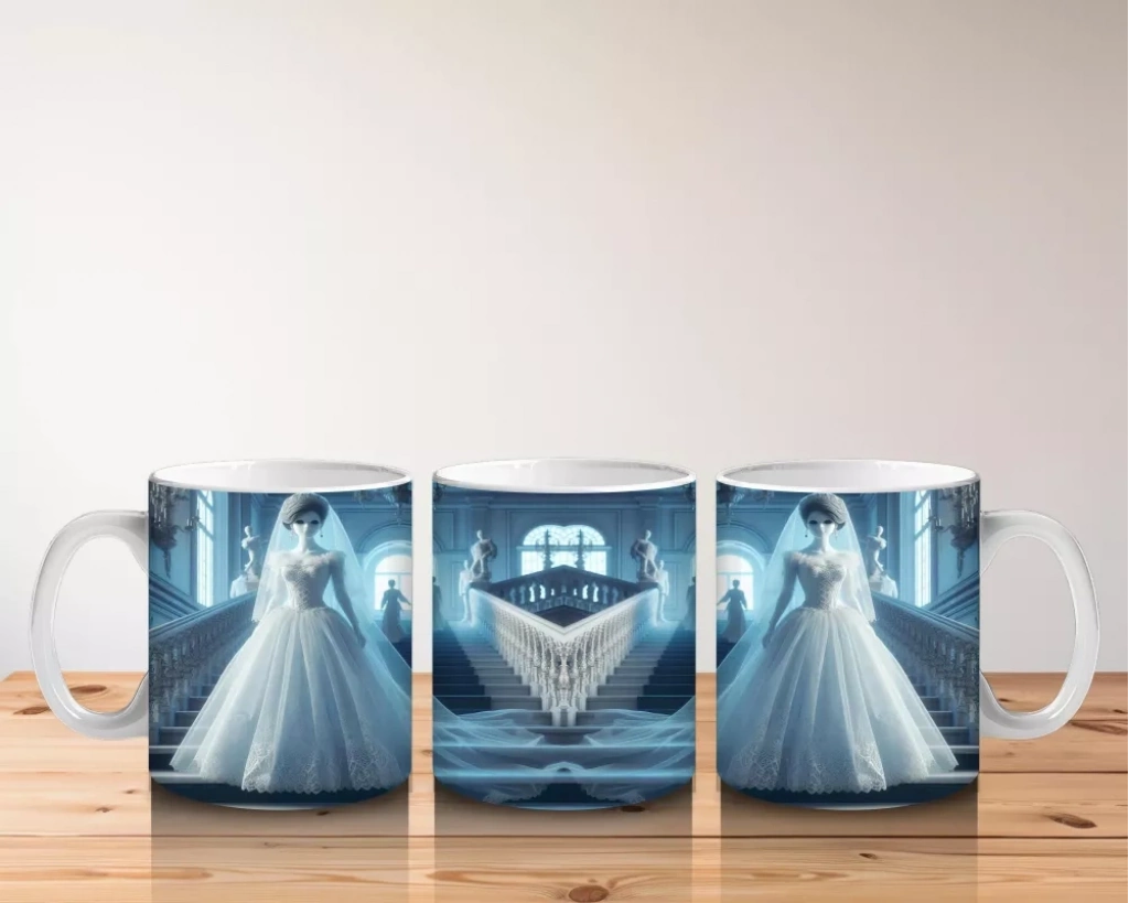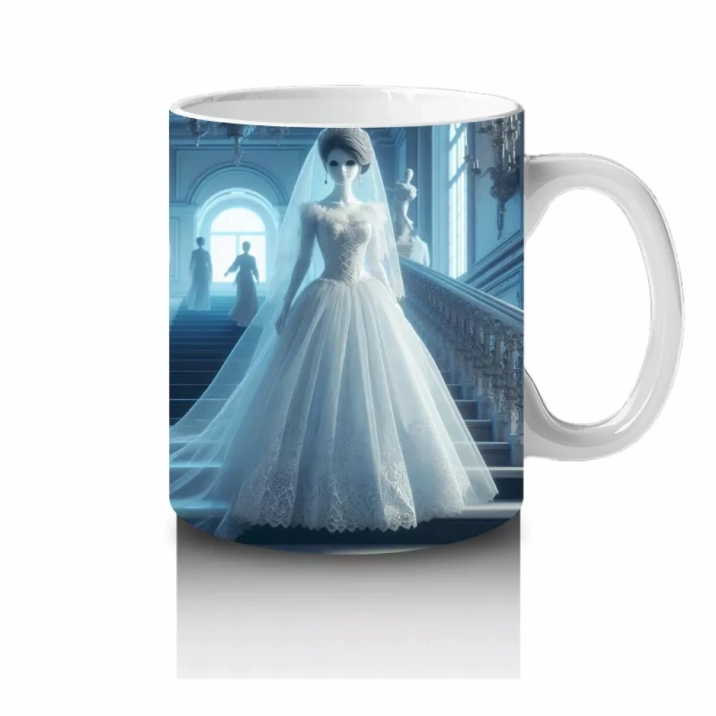 Beyaz Elbiseli Hayalet Gelin Figürlü Sisli Cadılar Bayramı Baskılı KupaBeyaz elbiseli hayalet gelin figürüyle hazırlanan bu sisli temalı kupa, Halloween kutlamalarınıza ürpertici bir atmosfer ekler.
