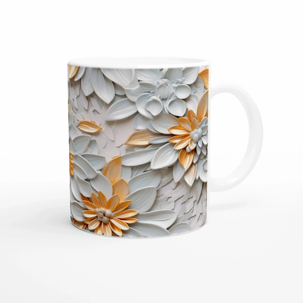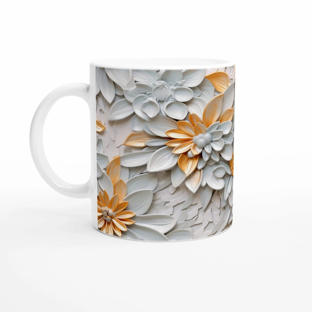 Beyaz ve Altın Detaylı Lüks Çiçek Desenli Kupa Bardak, parlak yüzeyi ve kabartmalı çiçek motifleriyle dikkat çeken özel bir tasarımdır. Sofistike tarzıyla masa üstünde şıklığı temsil eder, hem günlük kullanım hem de özel günler için etkileyici bir hediye alternatifi oluşturur.