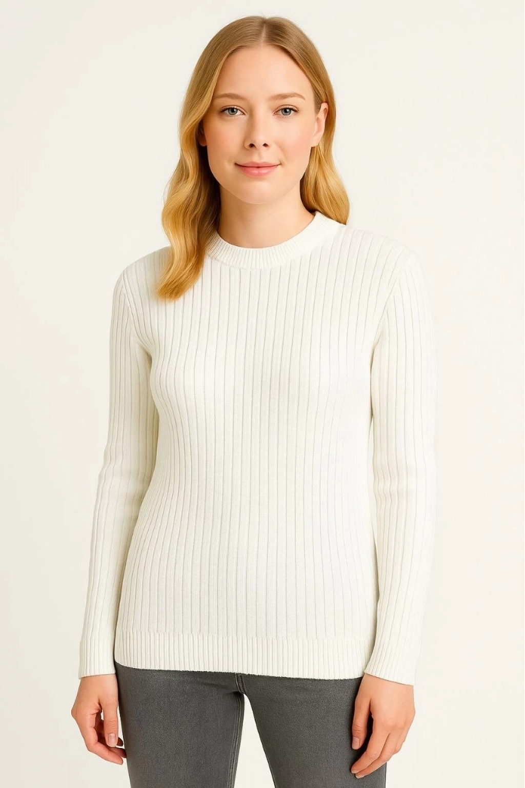 Bisiklet Yuvarlak Yaka Triko Kazak Pamuklu Kalın Fitilli Dokuma, Regular Fit Uzun Kollu Kışlık Model - Beyaz
