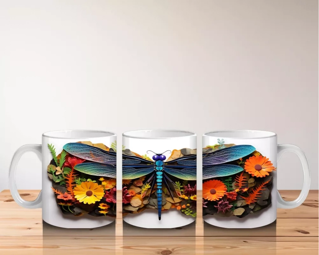 Canlı Çiçekler Üzerine Konmuş Mavi Yusufçuk Tasarımı – Baskılı Kahve Kupası