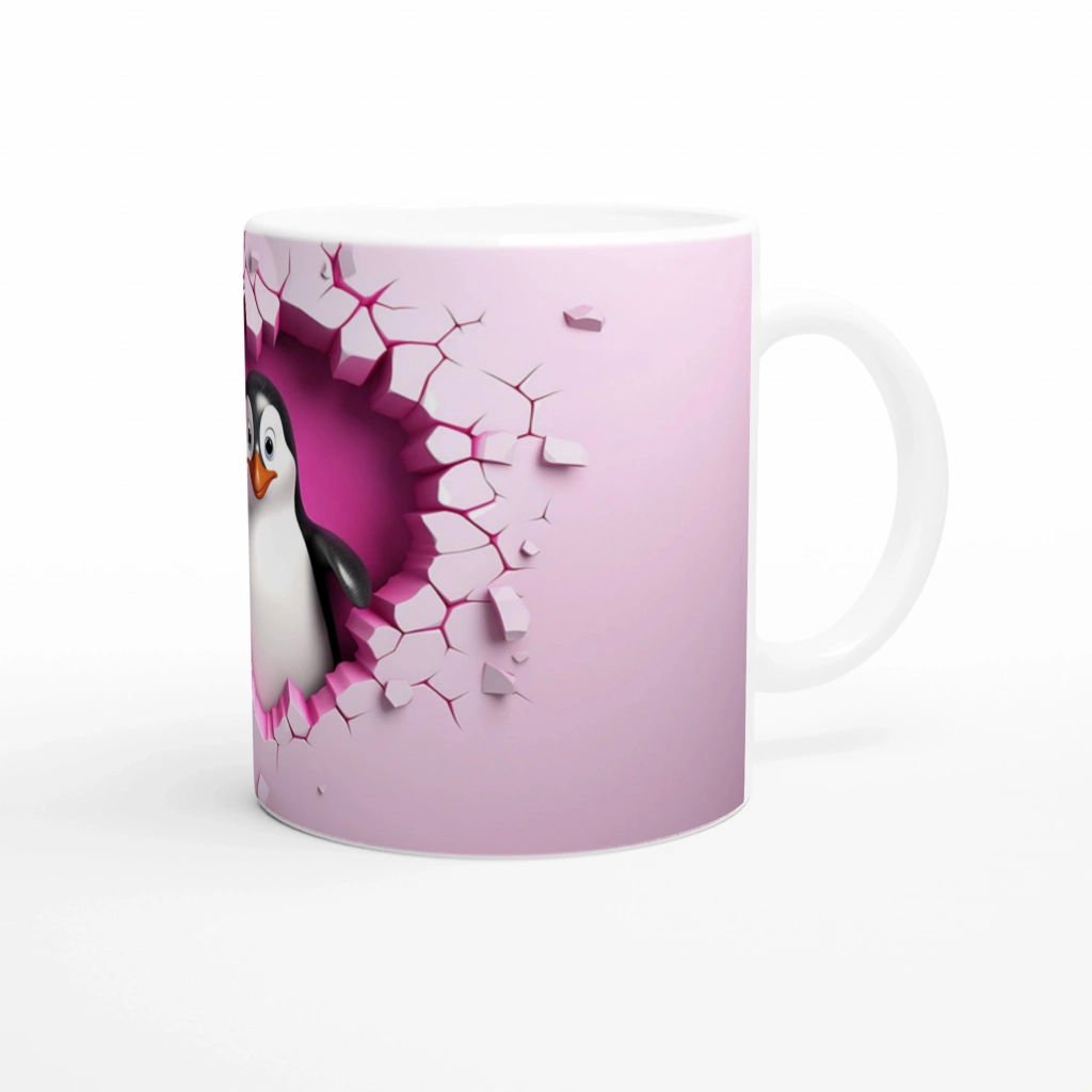 Pembe tonlardaki kalp şeklinde çatlamış duvardan bakan karikatür tarzı penguen figürüyle tasarlanmış bu kupa, sıcak içeceklerinize eğlenceli bir dokunuş katıyor.