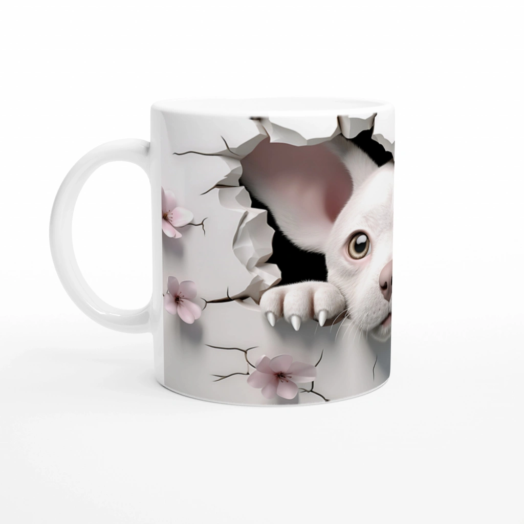 Çatlak Duvardan Bakan Sevimli Köpek Temalı Baskılı Kupa Bardak, çatlamış beyaz duvarın arasından çıkan masum köpek yüzü ve etrafına serpiştirilmiş narin pembe çiçeklerle zarif bir atmosfer sunuyor. Sıcacık duygular arayanlar için harika bir tercih.