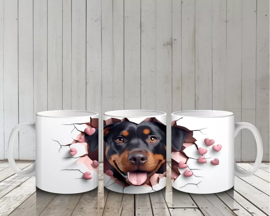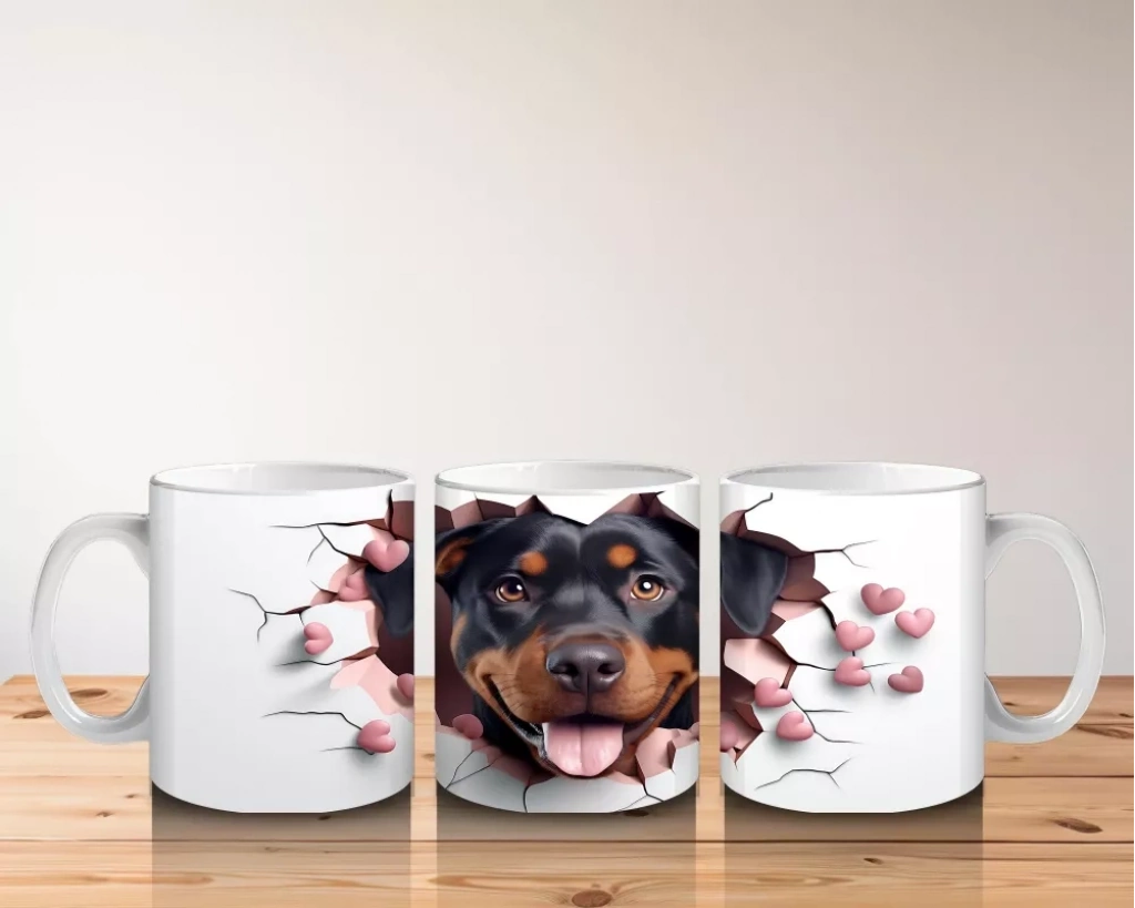 Çatlak duvarın ardından dikkatle bakan sevimli siyah köpek, meraklı ve korumacı ifadesiyle bu kupaya karakter katıyor. Sadık dostların enerjisi hep sizinle.