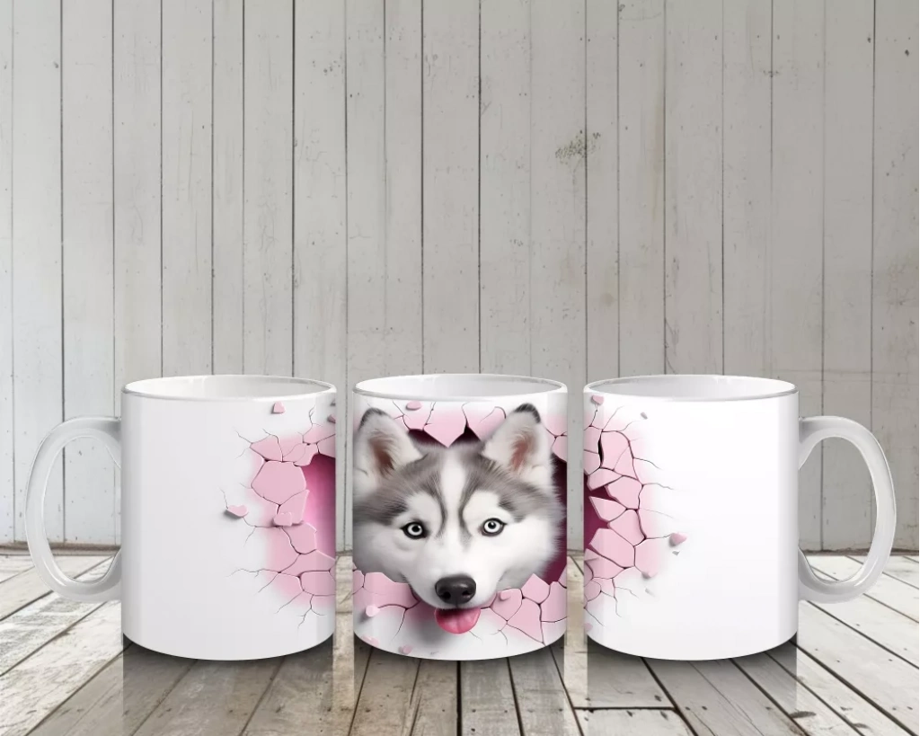 Çatlak zeminden bakan sevimli husky illüstrasyonu, güçlü ve sevimli bir duruş sergiliyor. Dinamik ve içten detayları sevenler için ideal bir kupa.