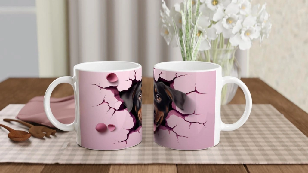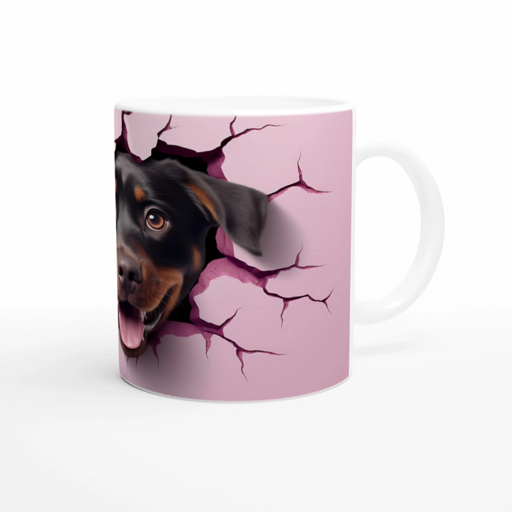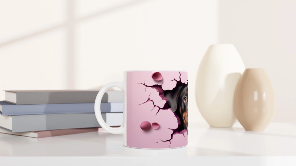 Çatlaktan Bakan Rottweiler Temalı Baskılı Kupa Bardak, pembe arka plan ve çatlak duvar efektiyle sert görünümüne rağmen sıcak ve samimi bir enerji sunuyor. Köpek severler için karakter dolu bir seçenek.