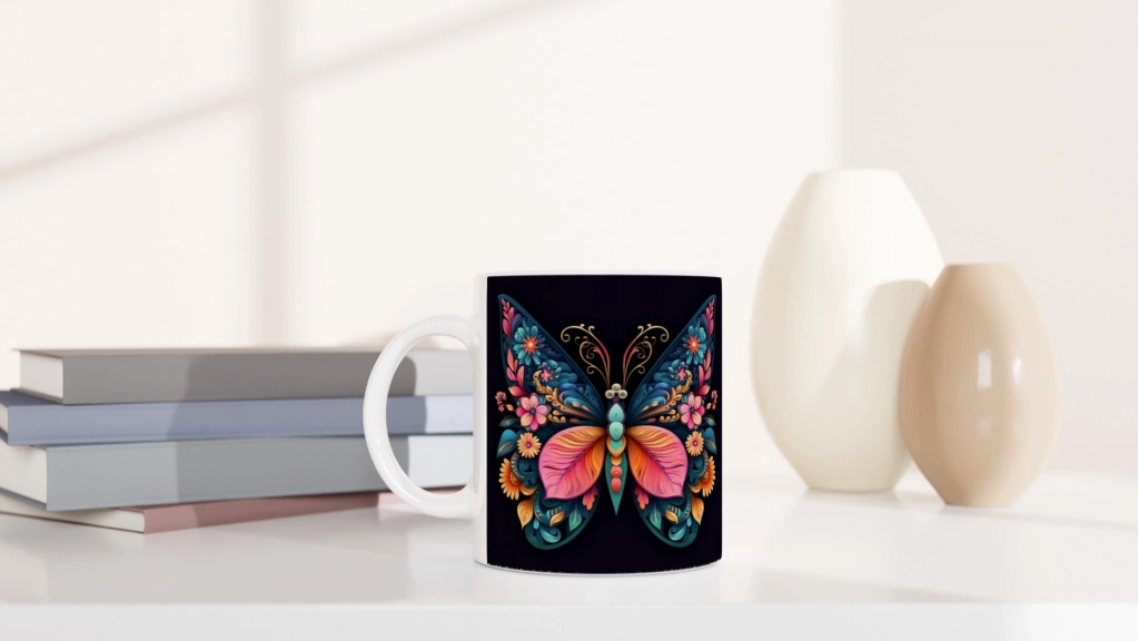 Renklerin dans ettiği bu kelebek desenli kupa bardak, doğanın zarafetini masanıza taşıyor.