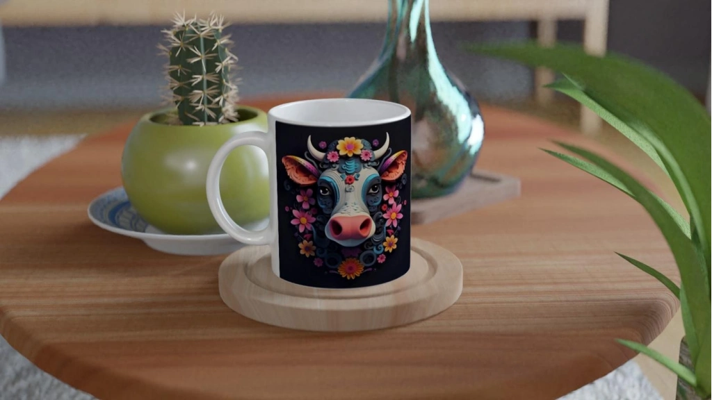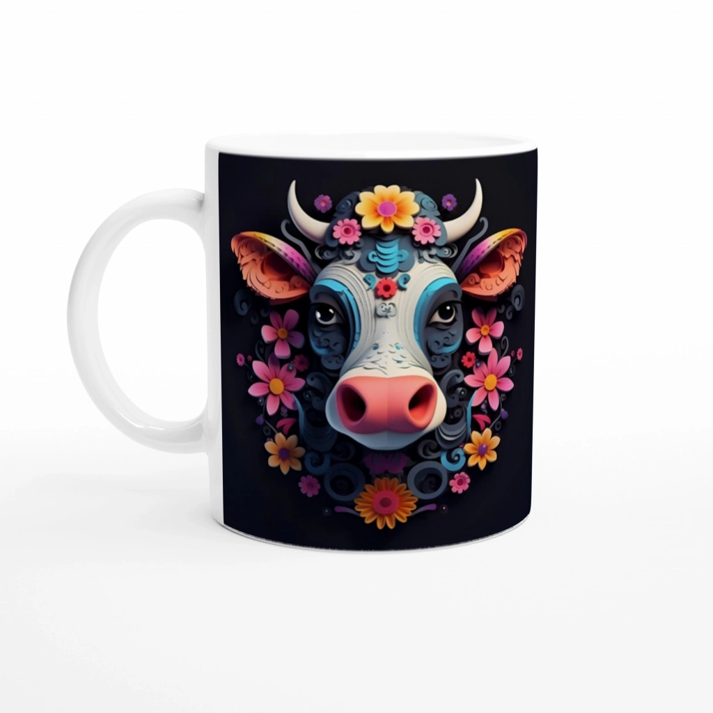 Neşeli bakışları ve çiçeklerle taçlandırılmış detaylı tasarımıyla bu inek baskılı kupa bardak,