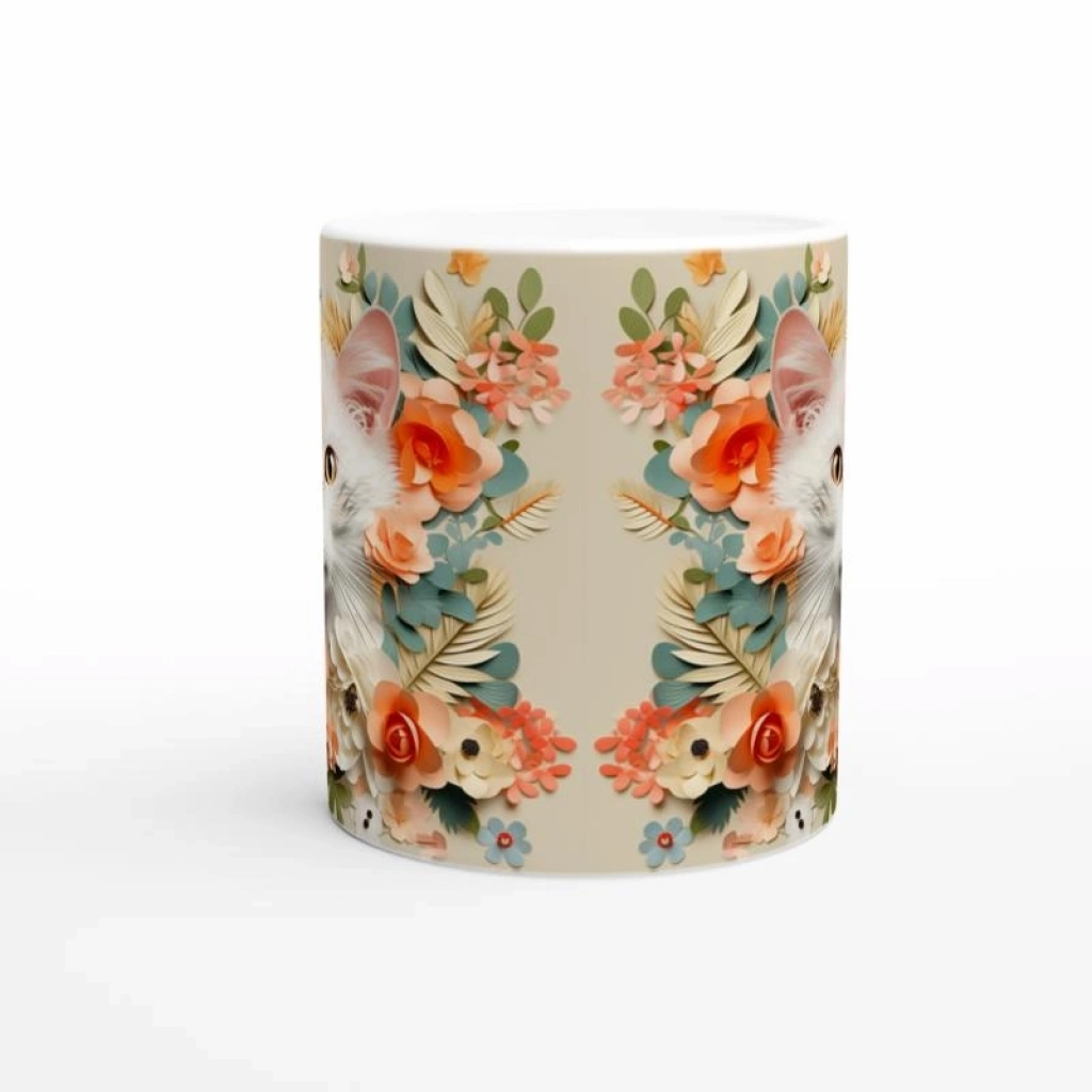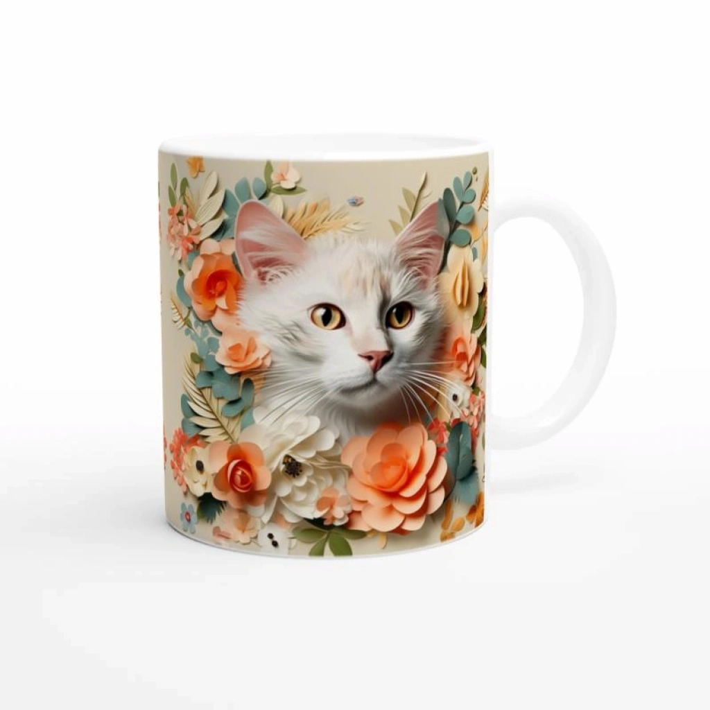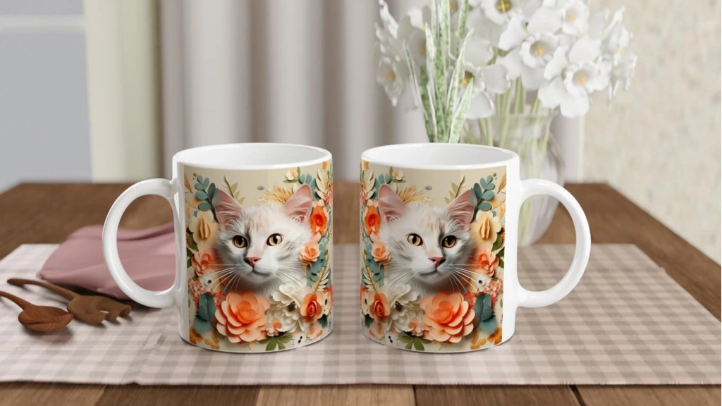 Çiçekler Arasında Bakışan Kedi Temalı Baskılı Kupa Bardak, pastel tonlarda tasarlanmış çiçek detayları ve sevimli kedi illüstrasyonuyla hem doğal hem de sıcak bir atmosfer sunar. Sanatsal ve hayvan sever ruhlar için özel bir hediye alternatifi.