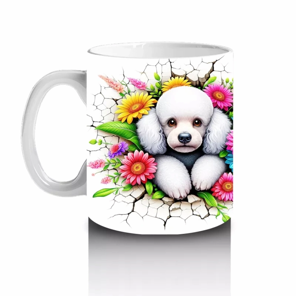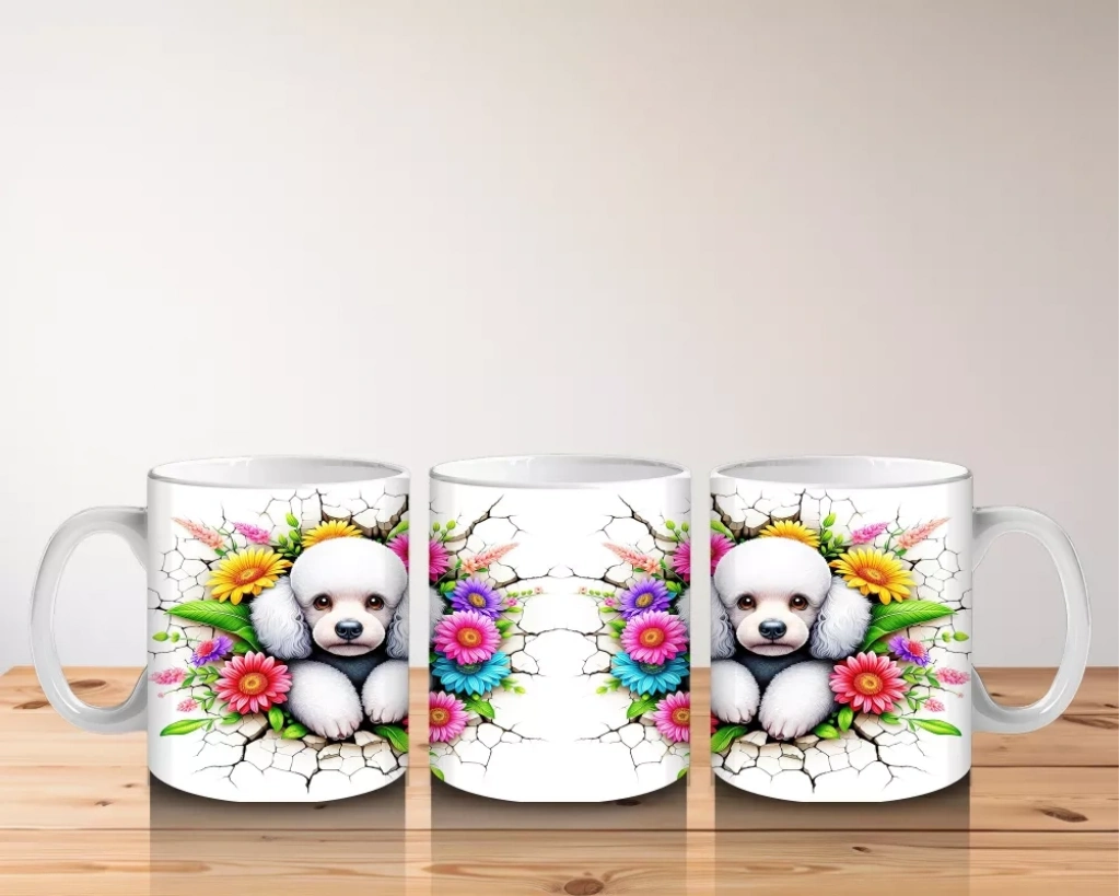 Renkli çiçekler arasında yan yana duran ikiz beyaz yavru köpekler, sevgi ve dostluğun simgesi olarak dikkat çekiyor. Sevimli ve samimi bir atmosfer yaratan şirin bir tasarım.