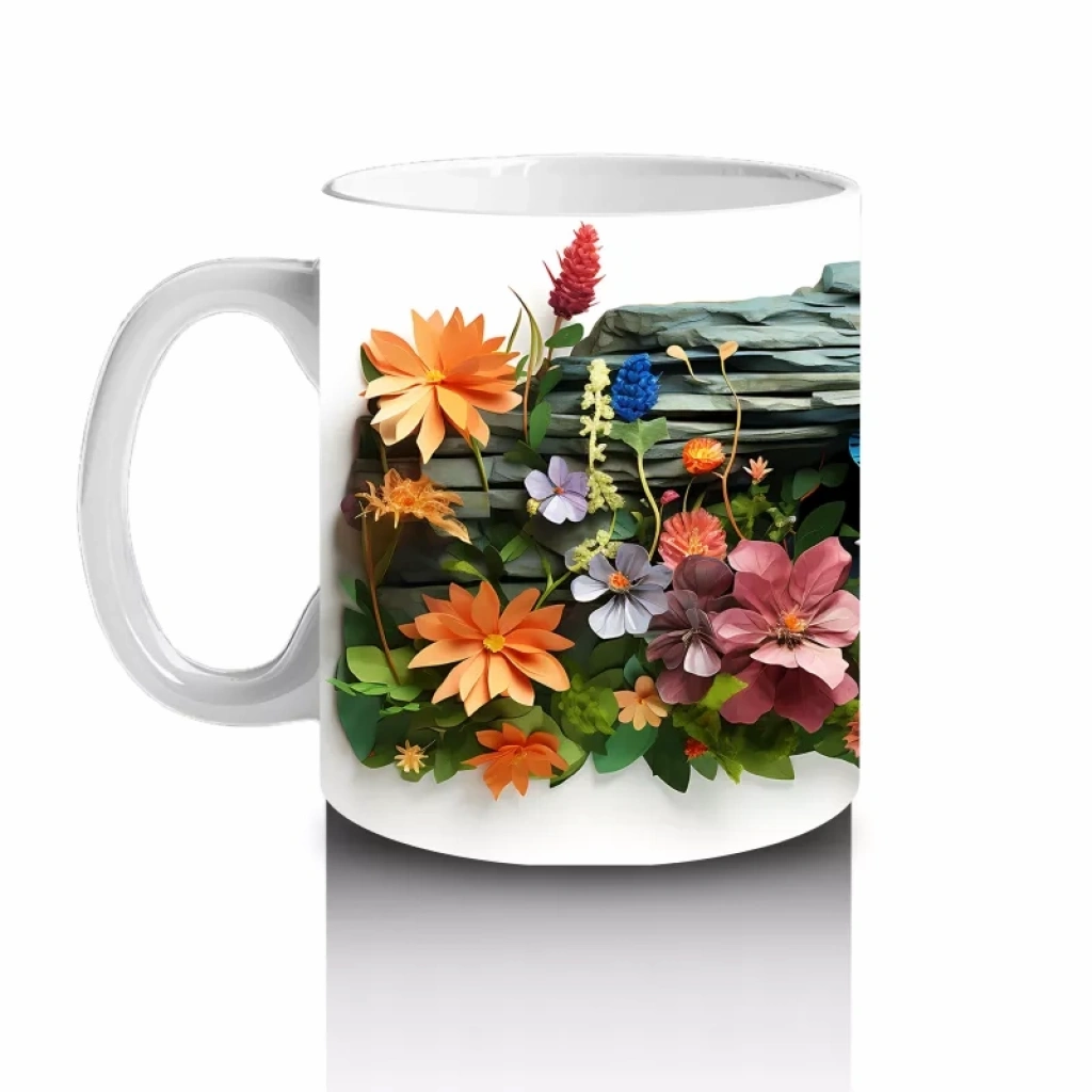 Çiçekler arasında süzülen mavi yusufçuk, zarafet ve huzuru yansıtıyor. Doğa temalı ve sakin tasarımlar arayanlar için ideal bir kupa.