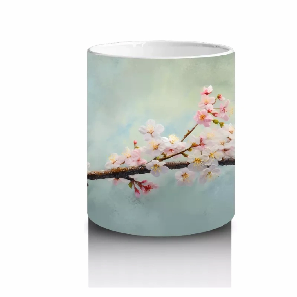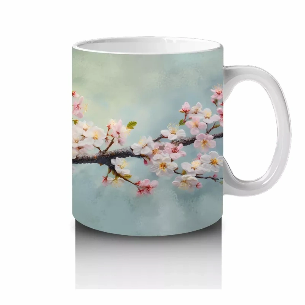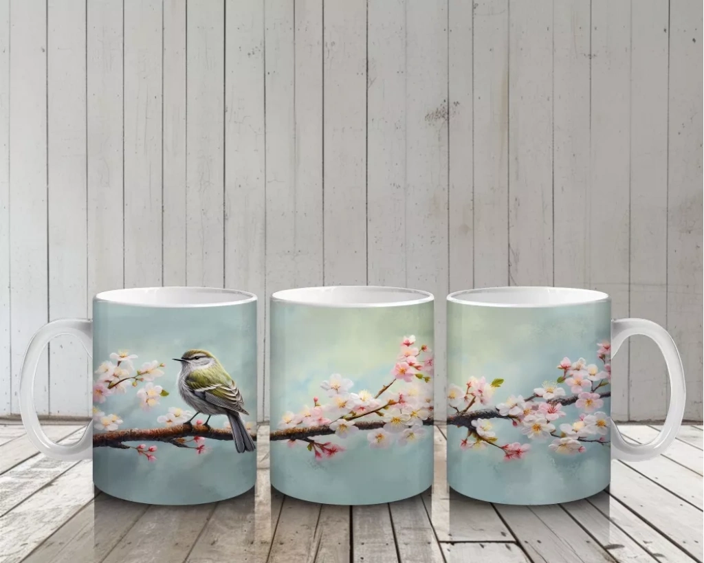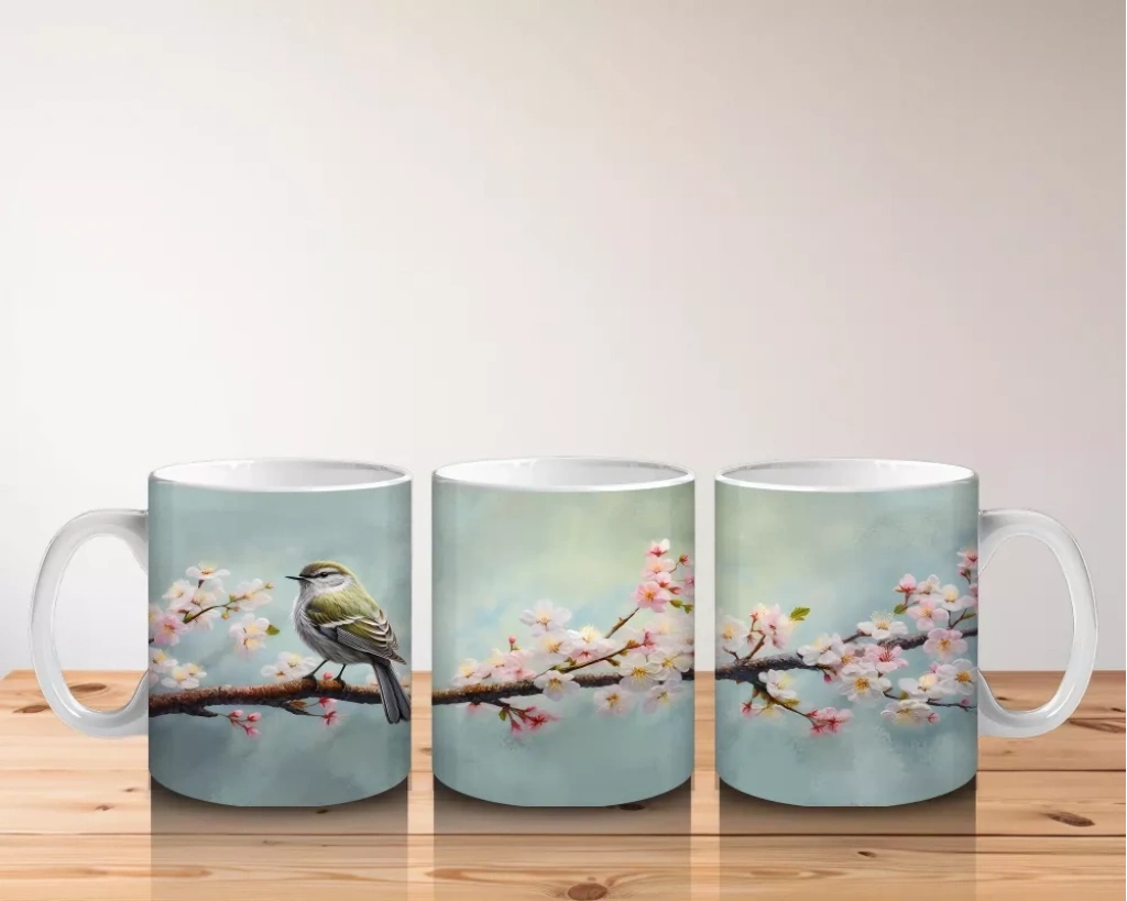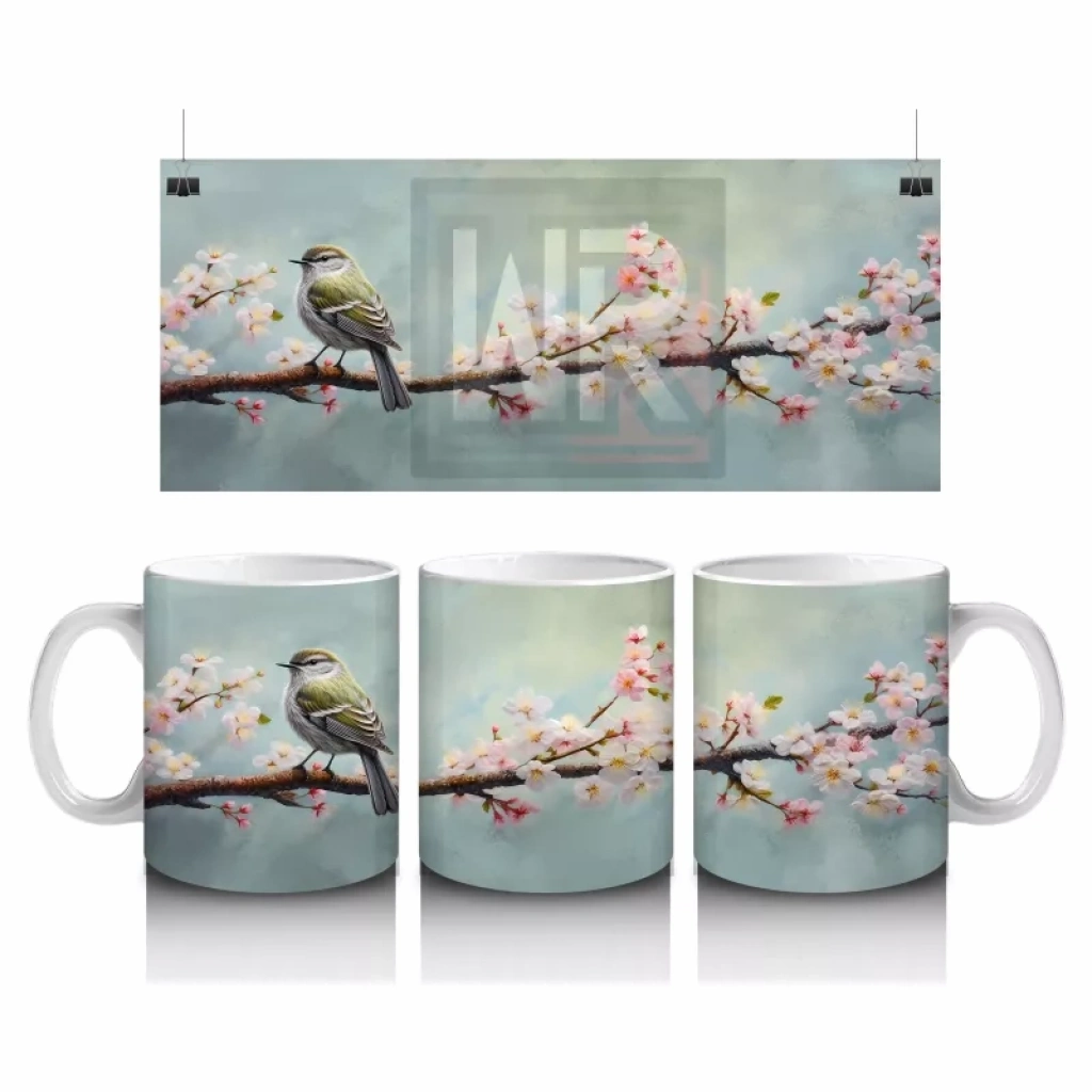 Zarif çiçeklerle süslenmiş bir dal üzerinde dinlenen serçe, doğanın huzurunu ve sadeliğini yansıtıyor. Doğaseverler için sakin ve şık bir kupa tasarımı.