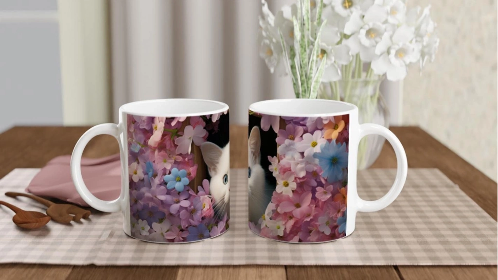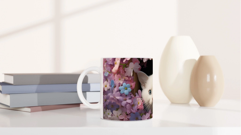 Çiçekli Pencereden Bakan Mavi Gözlü Kedi Temalı Baskılı Kupa Bardak, ahşap çerçeveli pencereden sevimli bir merakla bakan beyaz kedisi ve çevresini saran pembe, mor ve mavi çiçekler ile her yuduma romantik bir dokunuş katıyor. Renklerin ve tatlılığın buluştuğu özel bir parça.