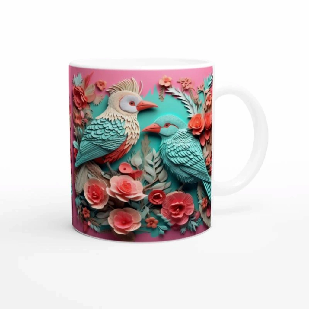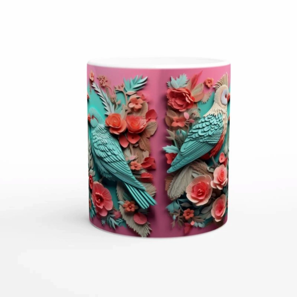 Canlı renkleri ve zarif detaylarıyla dikkat çeken tropikal kuş baskılı kupa bardak,