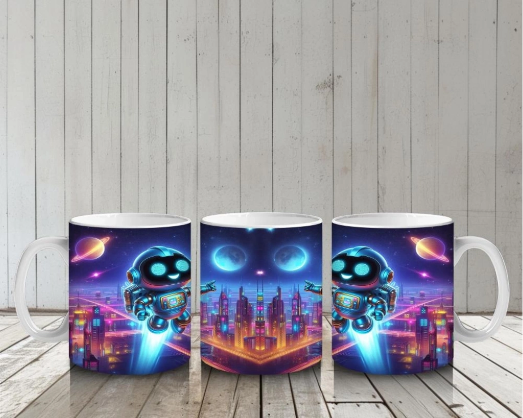 Çocuklara Sütü Sevdiren Gece Şehrinde Uçan Neşeli Robot Desenli Kupa Bardak