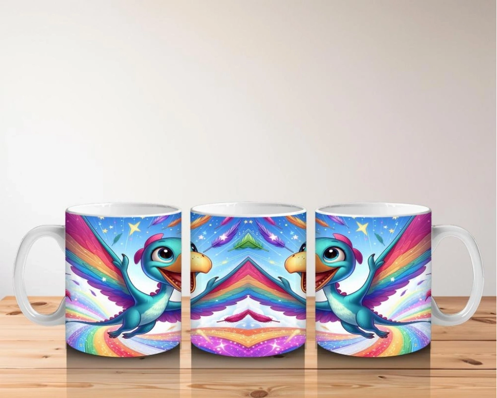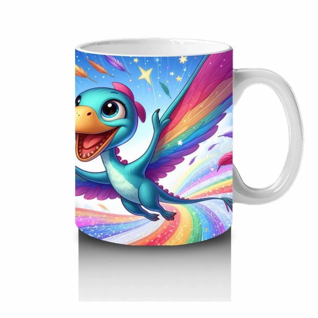 Gökkuşağının üstünde süzülen tatlı bir dinozorla süt içmek artık bir hayal yolculuğu! Minikler bu renkli kupaya bayılacak.