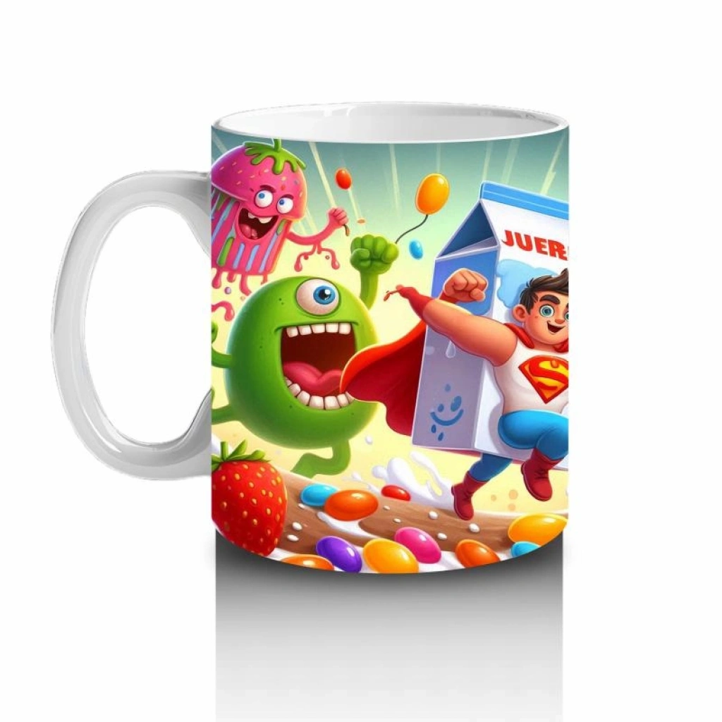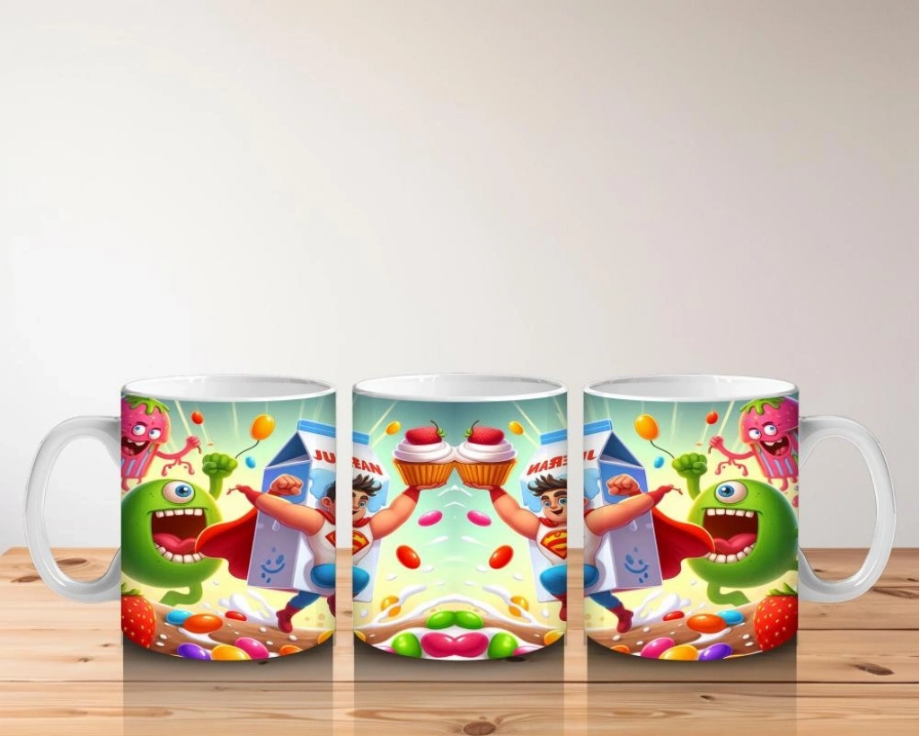 Süper güçleri sütle gelen bir kahraman ve etrafında neşeli tatlı canavarlar! Bu kupa, süt içmeyi miniklere eğlenceli bir görev gibi hissettiriyor.