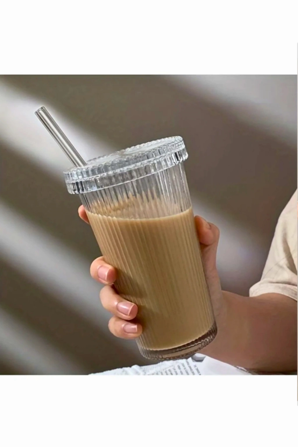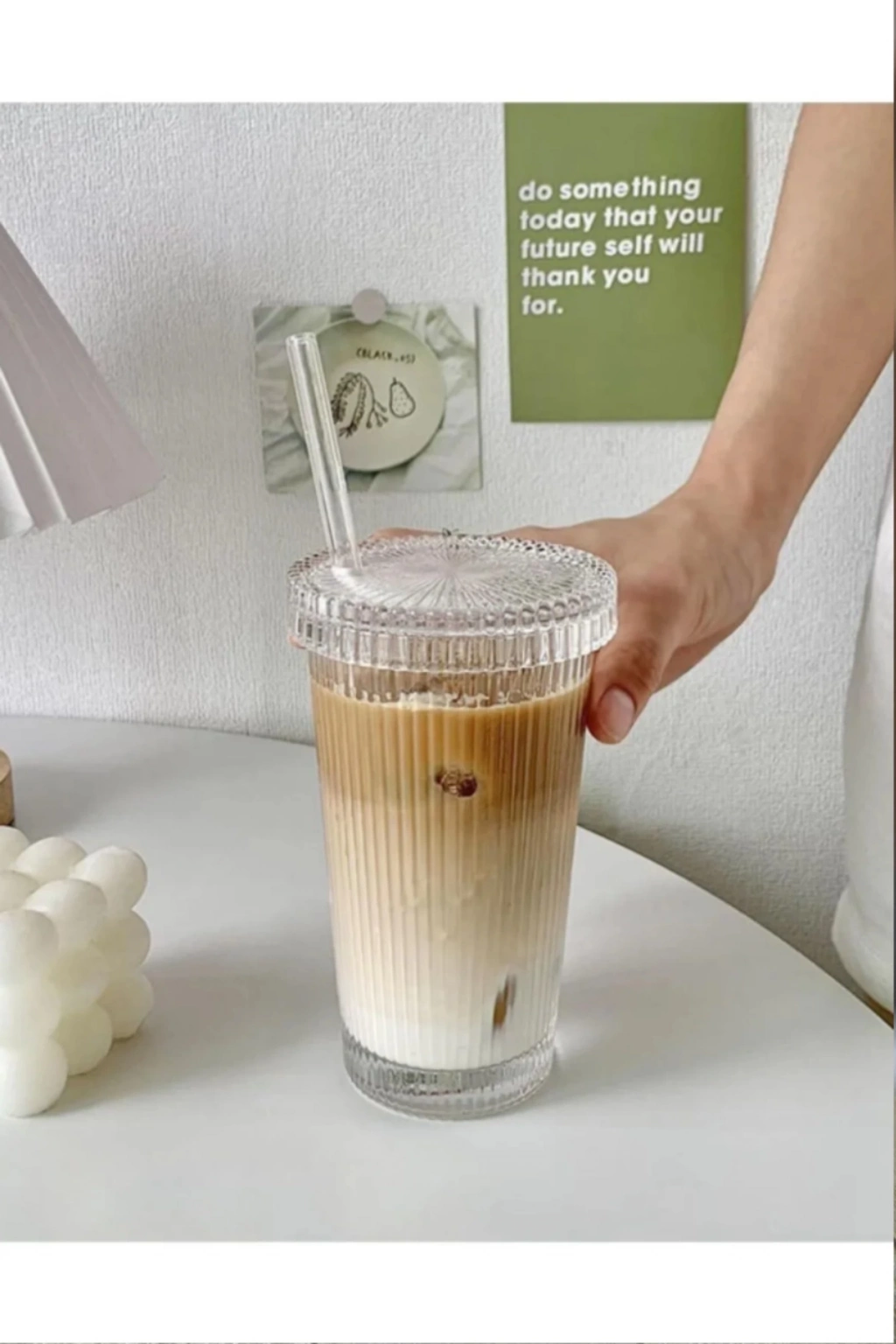 ÇOK SATAN 2 Adet Latte Kapaklı Pipetli Kristal Desen Fenomen Bardak Soğuk Kahve, Smoothie, İçecek Bardağı