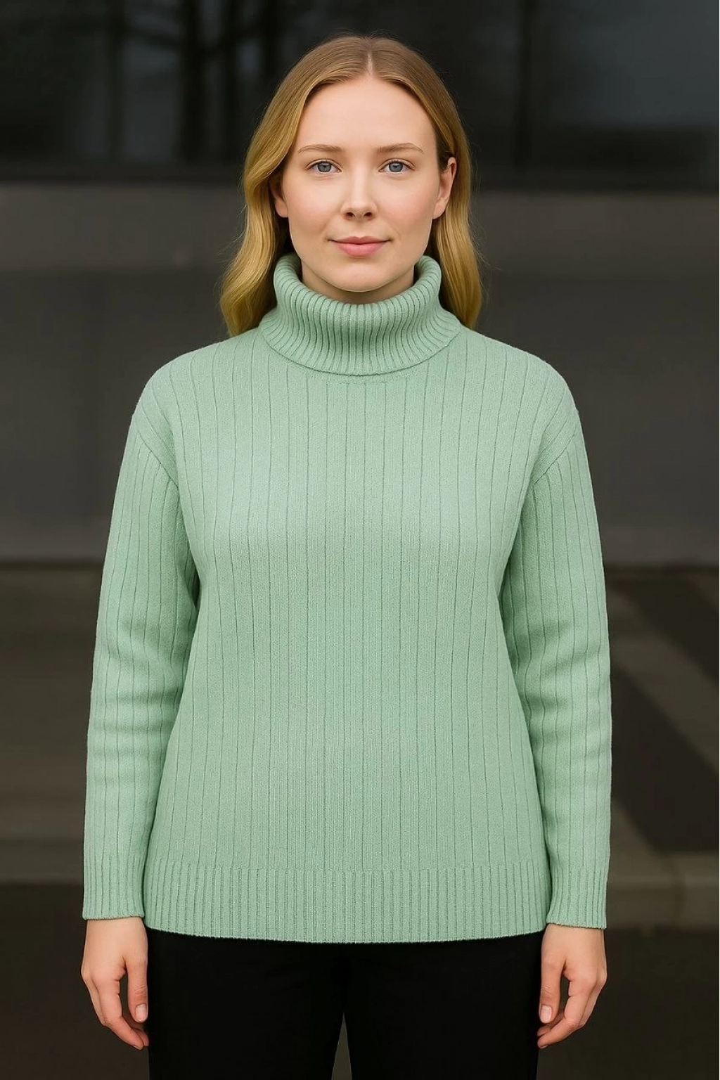 Balıkcı Yaka Bağazlı Triko Kazak Pamuklu Kalın Fitilli Dokuma - Mint Yeşili