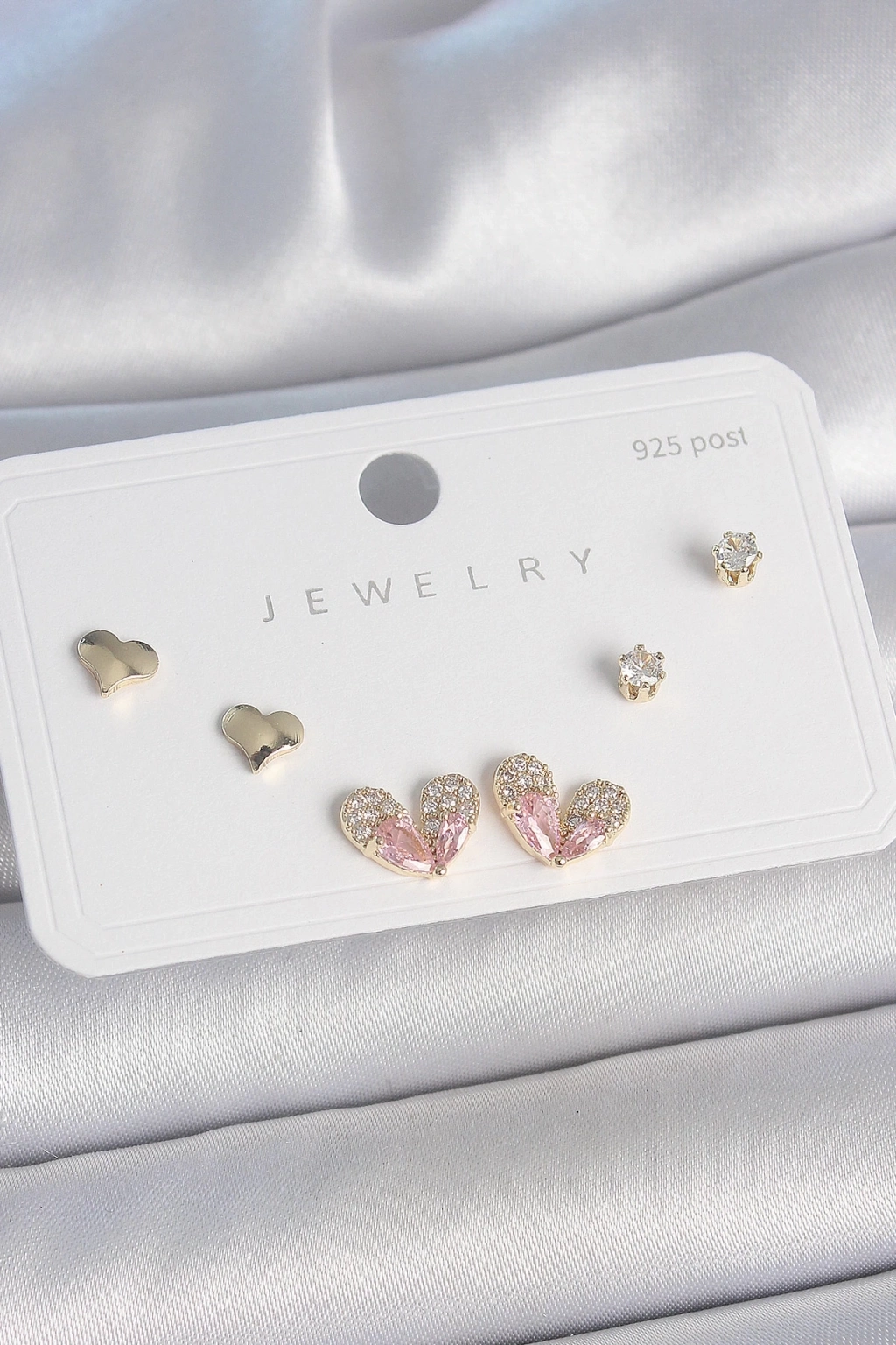 BFS Pirinç Gold Renk Pembe Zirkon Taşlı Kalp Model 925 Ayar Gümüş Çivi Kadın Küpe Seti