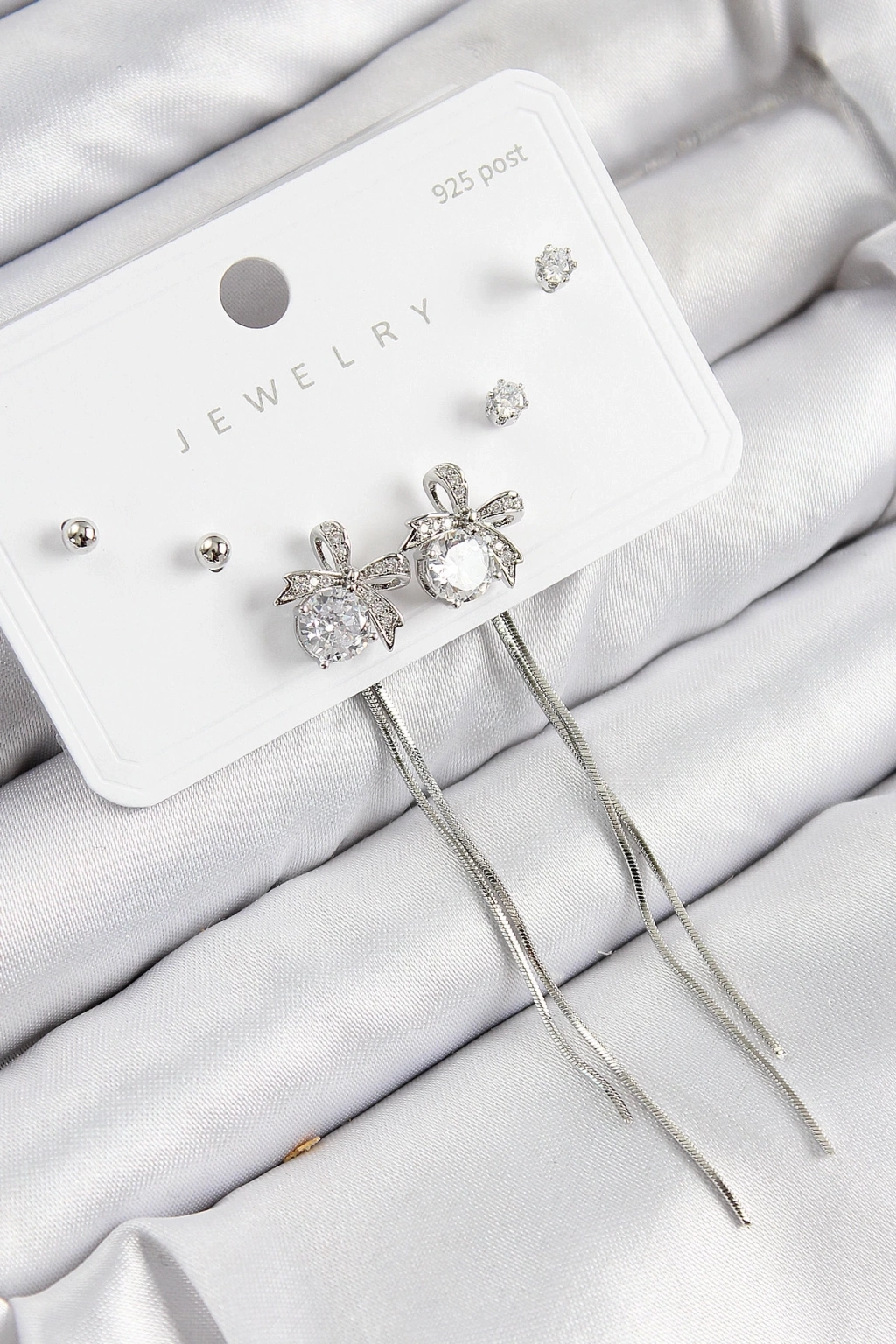 • BFS Pirinç Zirkon Taşlı Sallantılı Fiyonk Model Gümüş Renk 925 Ayar Gümüş Çivi Kadın Küpe Set