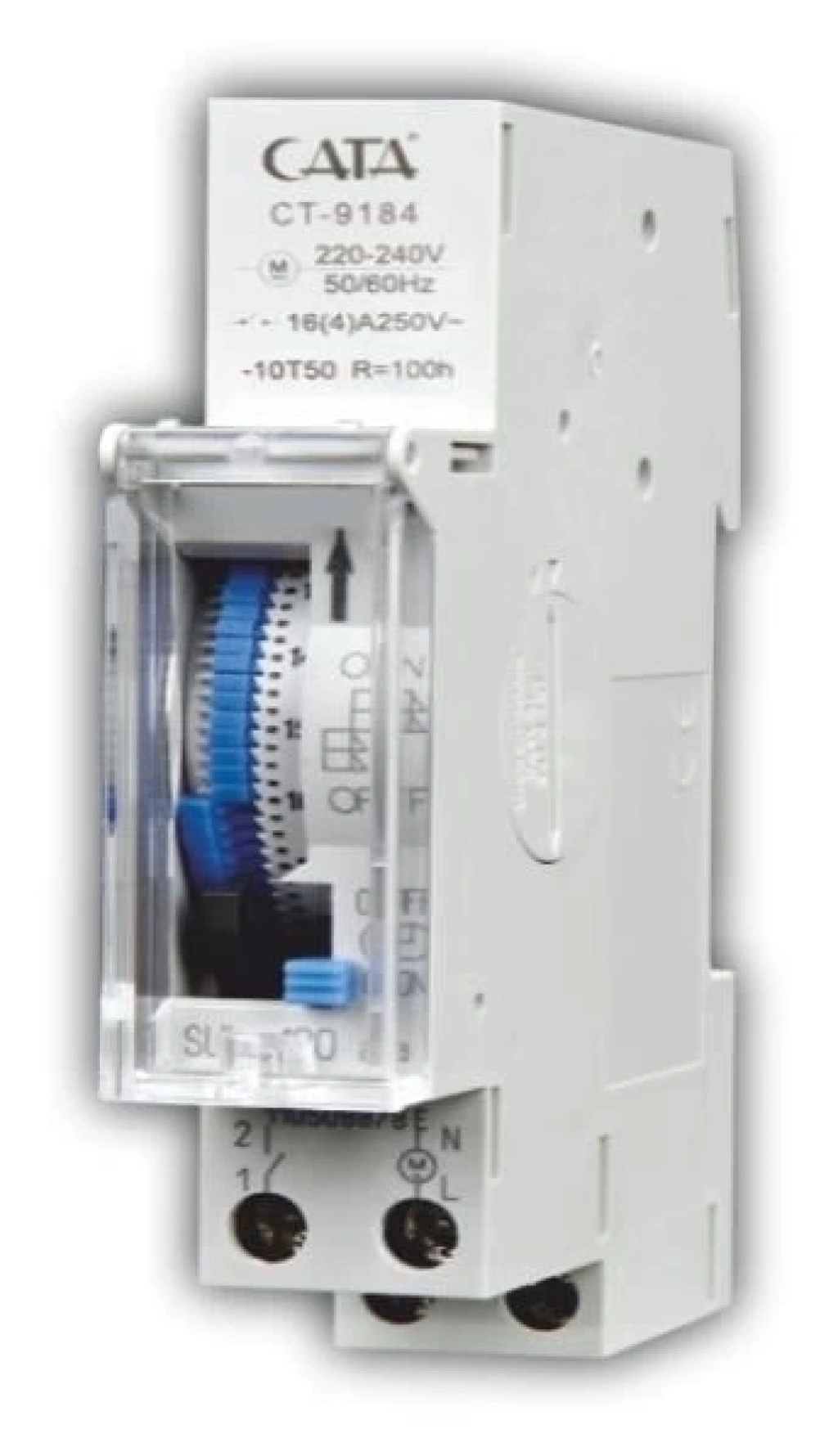 CATA CT 9184 Otomat Tipi Zaman Saati, elektrikli cihazlarınızı belirlediğiniz saat aralıklarında otomatik olarak açıp kapatmanızı sağlar. Günlük programlama özelliği ile enerji tasarrufu ve sistem otomasyonu için idealdir.