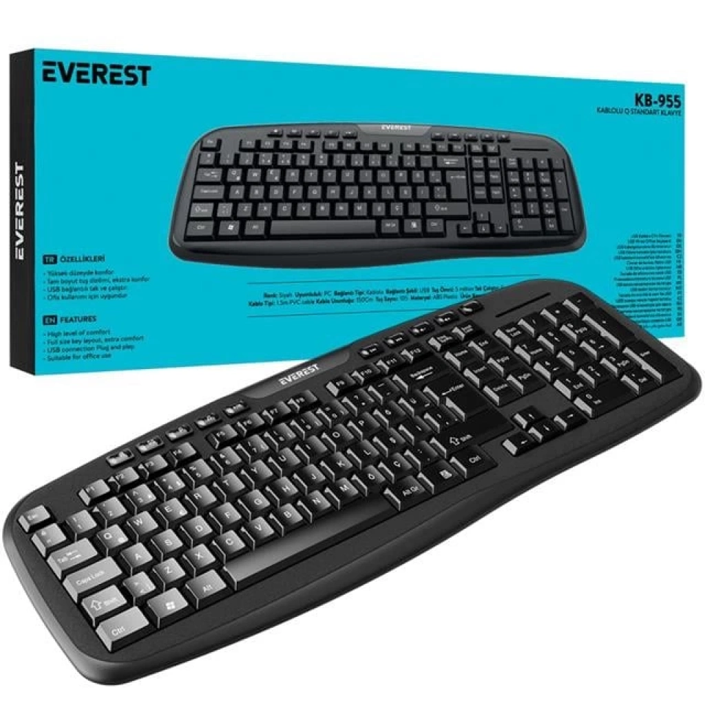 Everest KB-955 Siyah Usb Multimedia Q Standart Klavye; ergonomik tasarımı ve tam boyutlu tuş dizilimi ile konforlu bir yazım deneyimi sunar. USB bağlantısı sayesinde tak-çalıştır özelliğine sahip olup, ofis ve günlük kullanım için tasarlanmıştır. Kaliteli tuş baskıları sayesinde harflerin, rakamların maksimum süre kalıcı olmasını sağlar ve uzun ömürlü kullanım imkanı tanır.