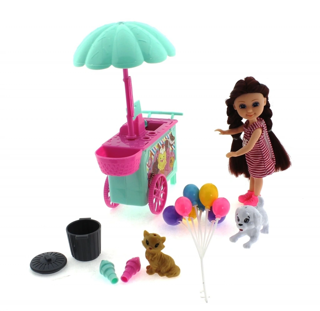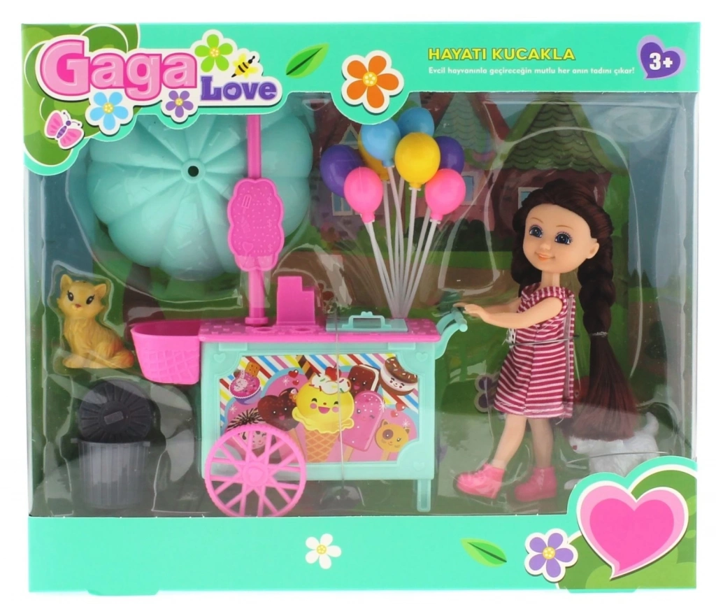Set içerisinde 1 bebek, 1 köpek, 1 kedi ,1 Dondurma Arabası balonlar 1 kapaklı çöp kovası, mevcuttur.
