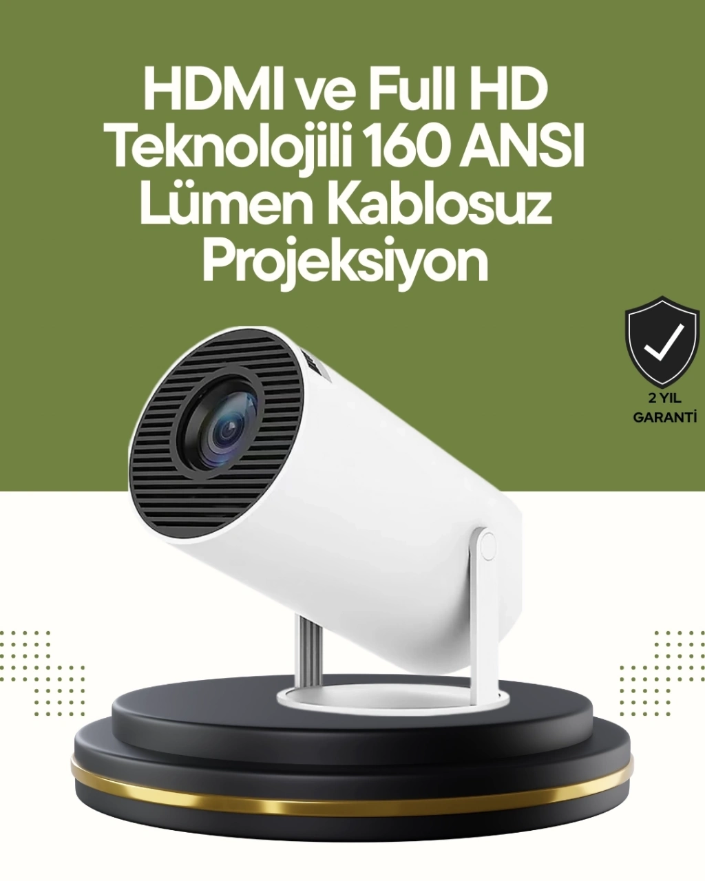 Bu cihaz, 130 inç geniş ekran desteği ile sinema keyfini ev ortamına taşır. Full HD çözünürlük ve 4K uyumluluk sayesinde filmler, diziler ve sunumlar net ve ayrıntılı şekilde görüntülenir. 160 ANSI lümen parlaklık, farklı ışık koşullarında net görüntü sağlar. HDMI ve USB girişleri ile oyun konsolu, bilgisayar veya medya oynatıcı bağlanabilir. Kablosuz bağlantı özelliği, mobil cihazlardan kolay içerik aktarımı yapma imkânı verir. 5000 saat ampul ömrü ile uzun süreli kullanım sağlar.