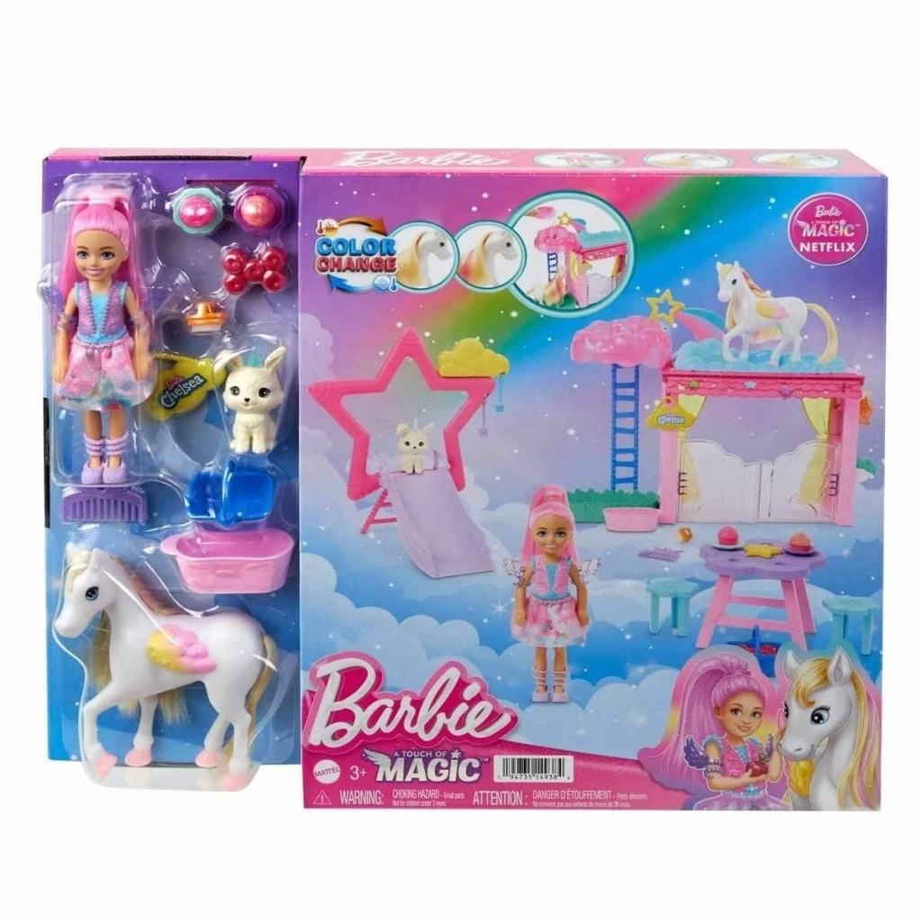 Barbie a Touch of Magic Chelsea ve Pegasus Oyun Seti, filmden ilham alan ışıltılı, kanat detaylı ve pembe bir kıyafet giymiş Chelsea bebek ve yine filmden esinlenmiş eğlenceli oyun alanları ve aksesuarlarıyla birlikte gelmektedir.