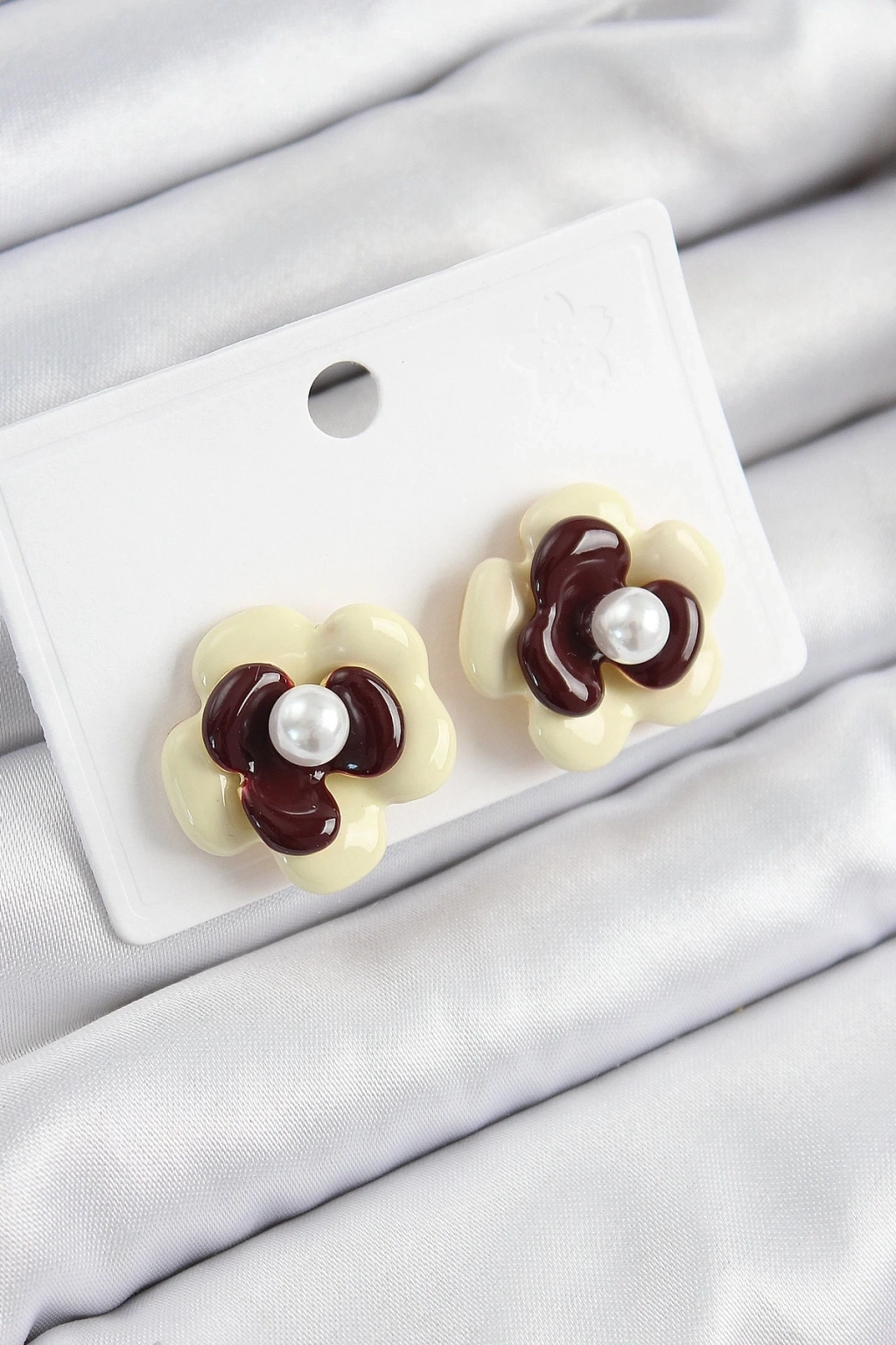 ÇOK SATAN İnci Detaylı Krem Kahverengi Renk Papatya Model Kadın Küpe